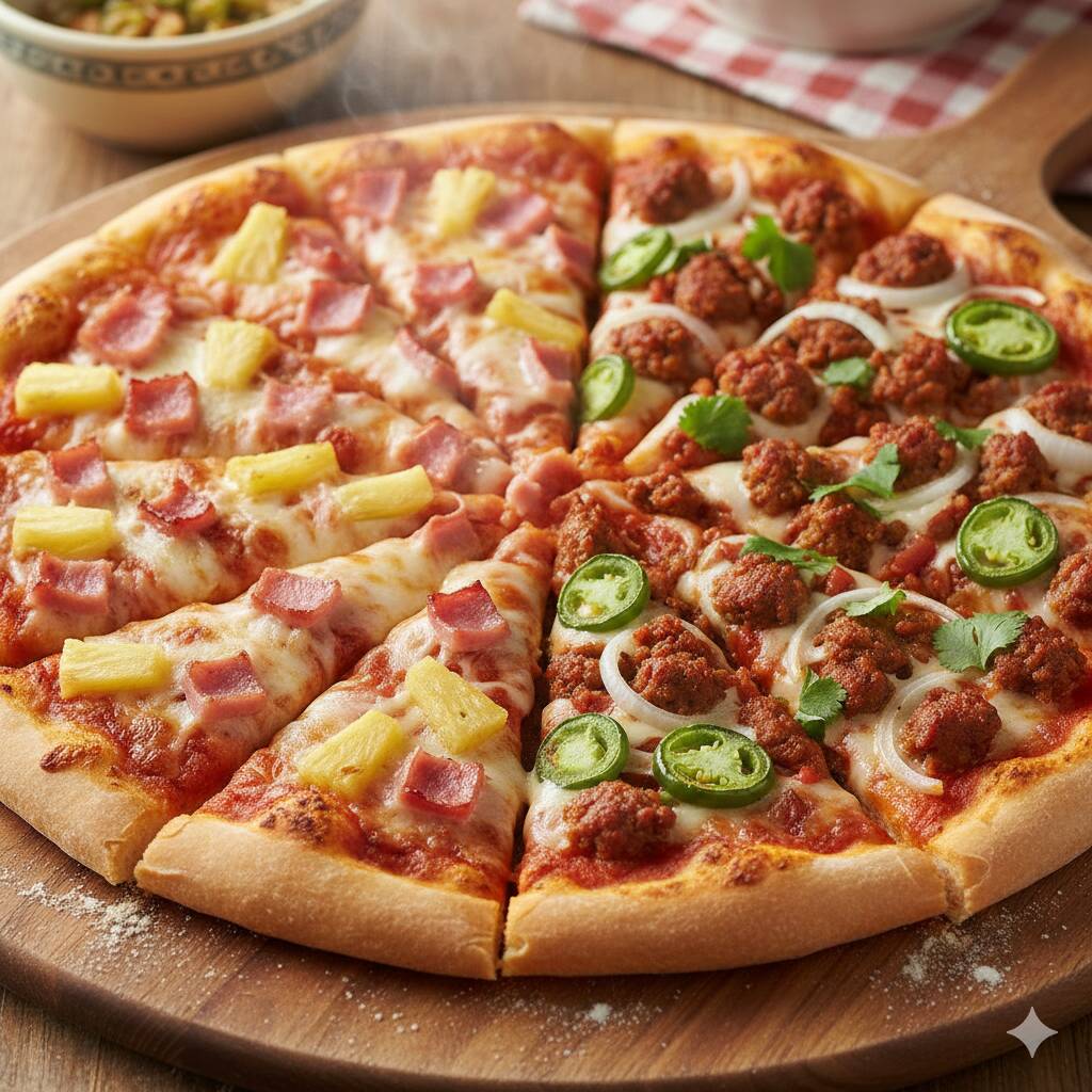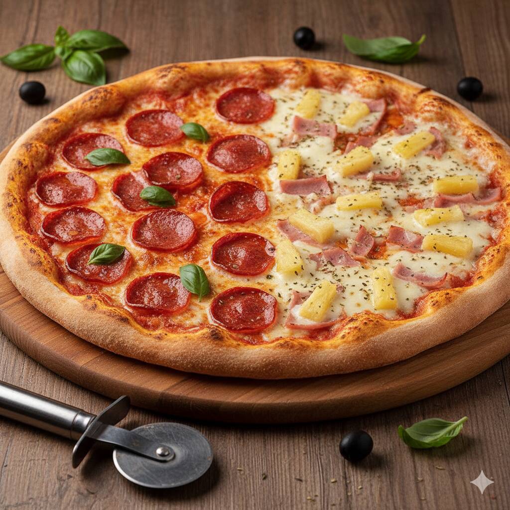 Pizza combinada mitad base de tomate, piña y jamon, mitad base de frijol, chorizo, jalapeño cebolla y queso