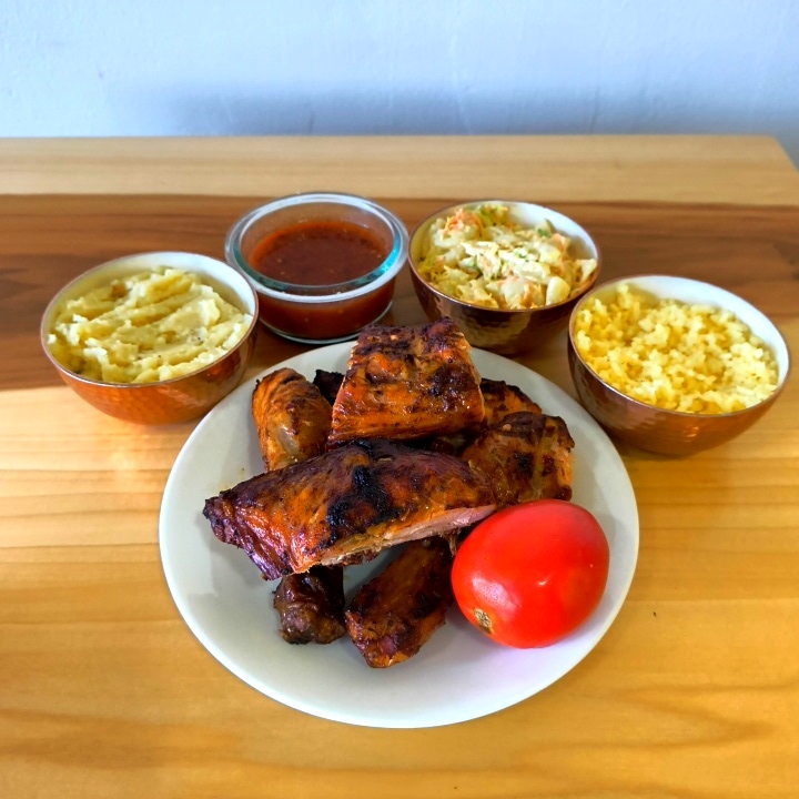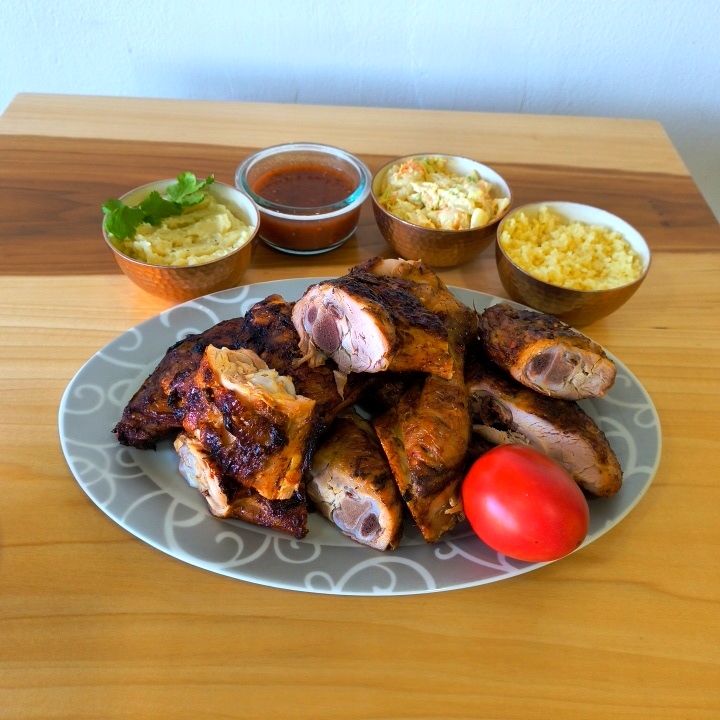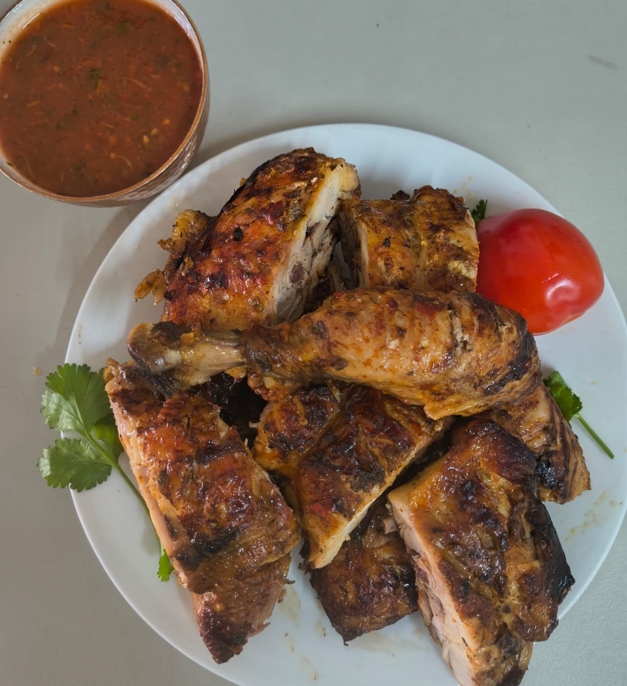 8 pzas Pierna y muslo, arroz blanco, ensalada de coditos, mantequilla, mayonesa, puré de papa, complementos grandes, incluye salsa y tortillas.