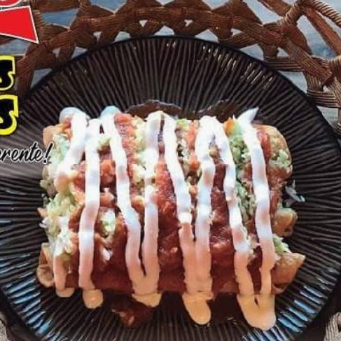Orden de 4 flautas doradas de pollo, llevan repollo, salsa y crema.