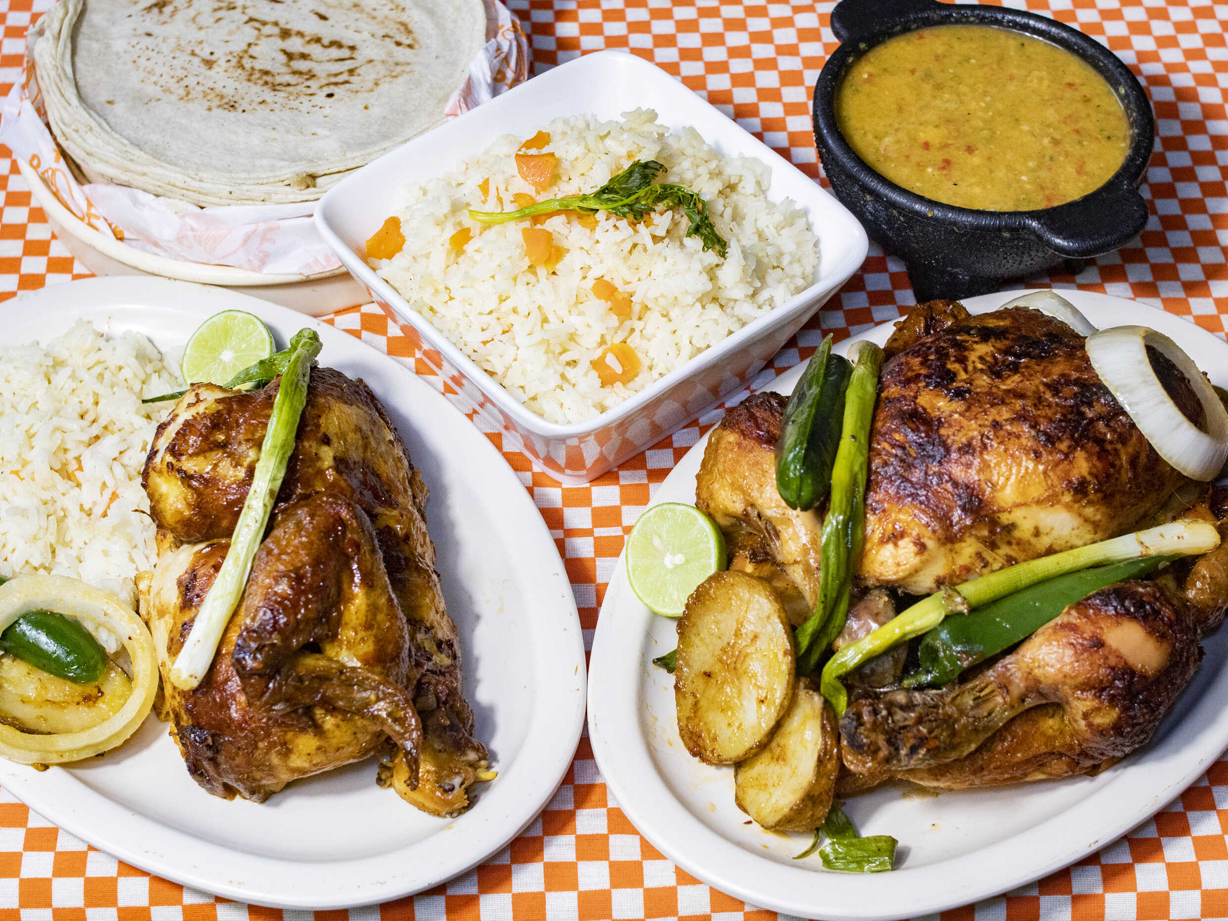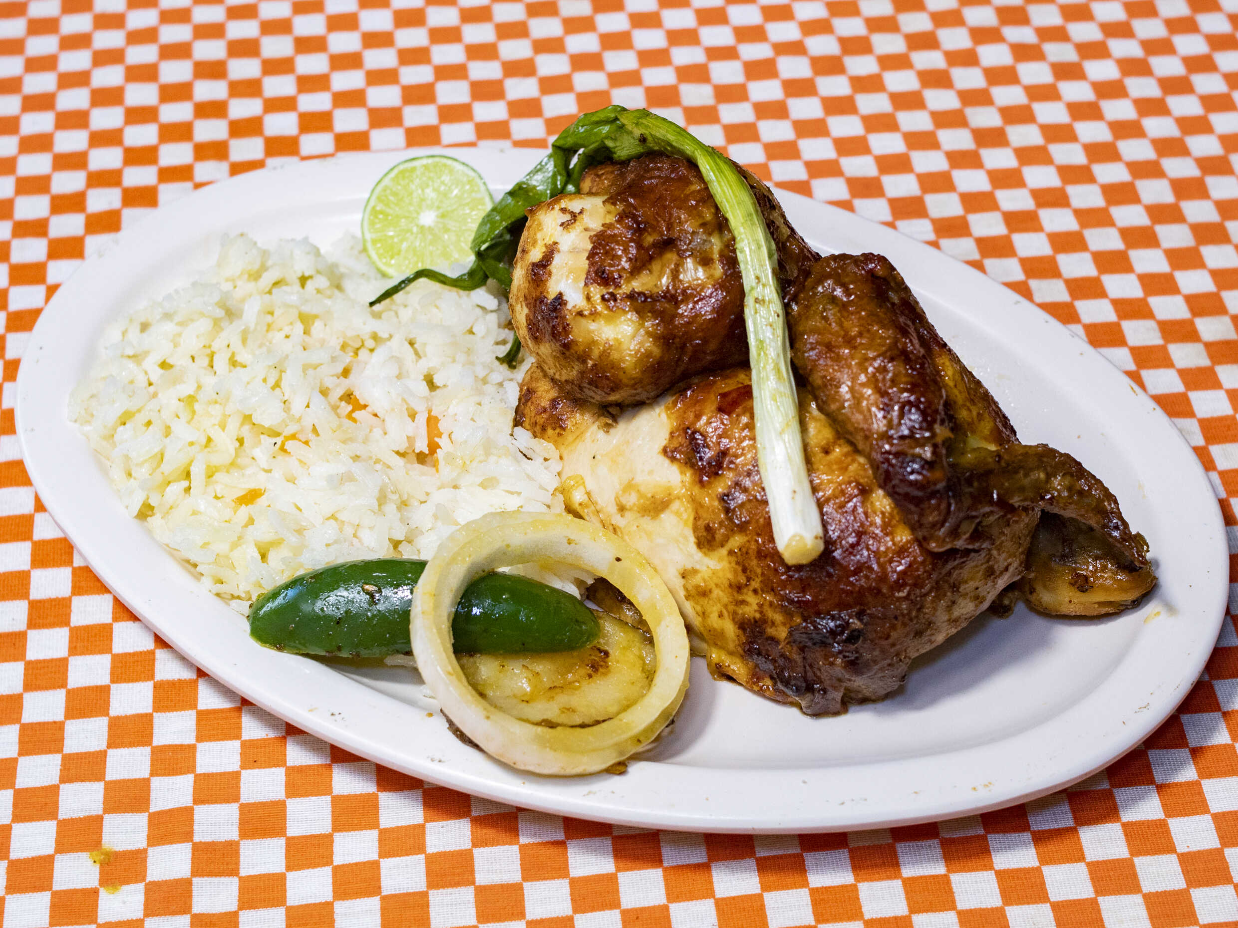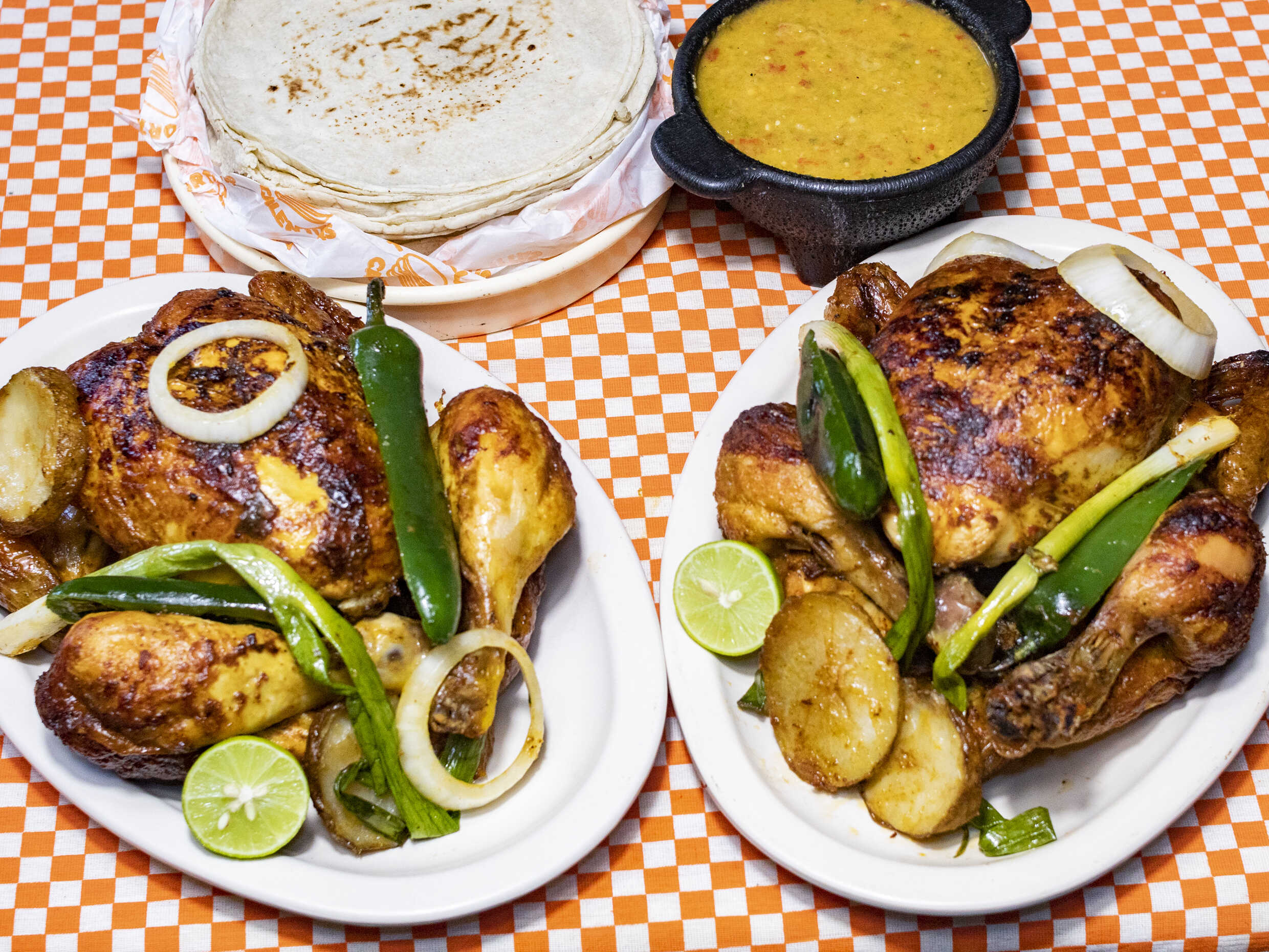 1 Pollo y medio, una porción de arroz, salsa de la casa y medio kilo de tortillas.