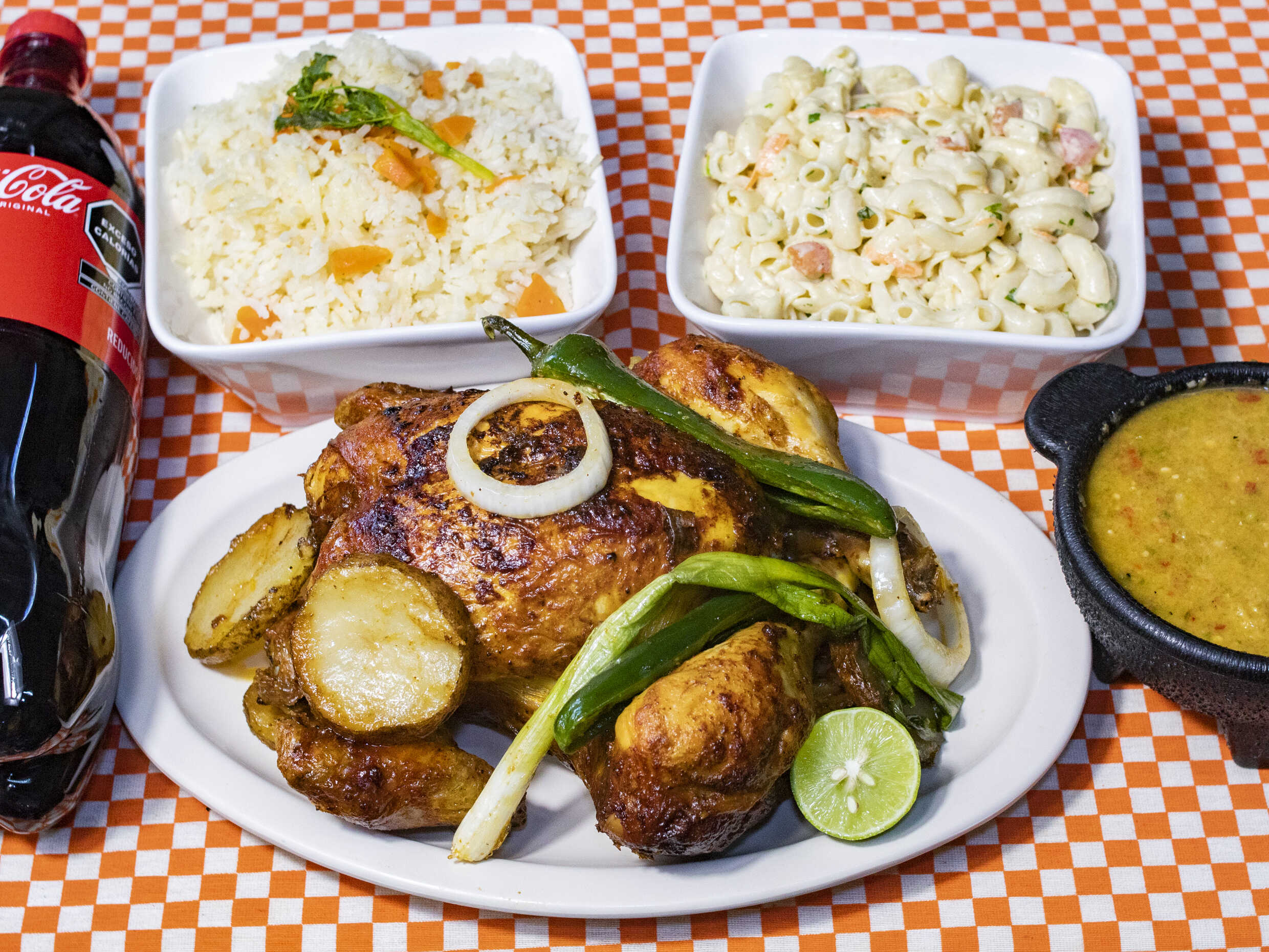 1 Pollo entero, porción de arroz, ensalada de pasta de coditos, salsa de la casa y 200 gr de tortillas.