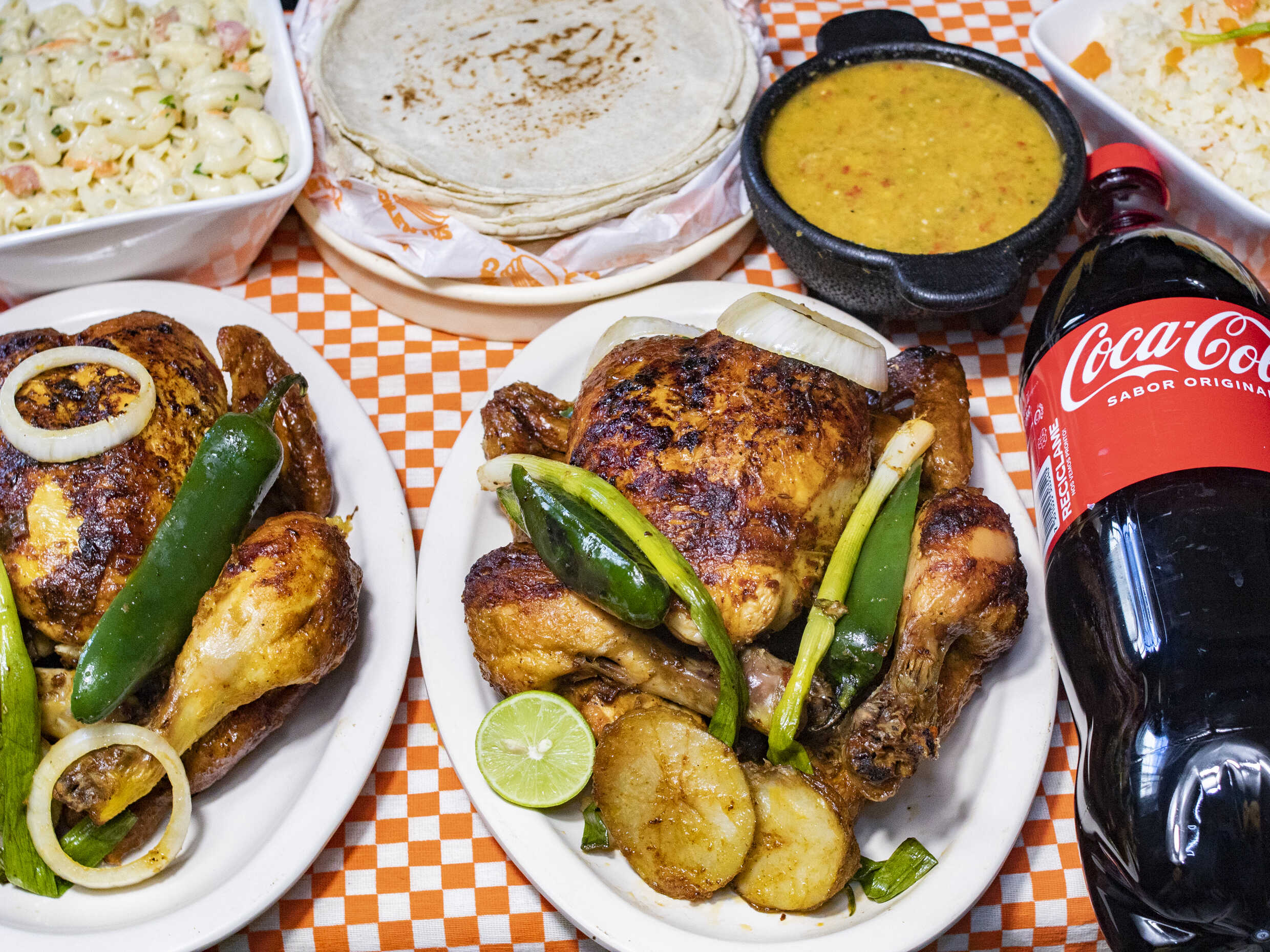 4 Pollos, 2 órdenes de arroz, 2 órdenes de ensalada de la casa, 1 orden de papas, 2 kg de tortillas y 2 refrescos 2 L.