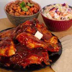 Medio pollo bañado en salsa BBQ con un toque de mantequilla, acompañado de tortillas.