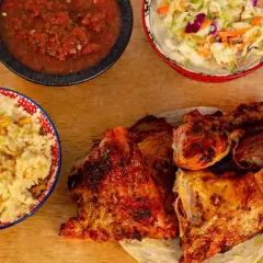 Pierna y muslo asados al carbón. Incluye 1 complemento, salsa y tortillas