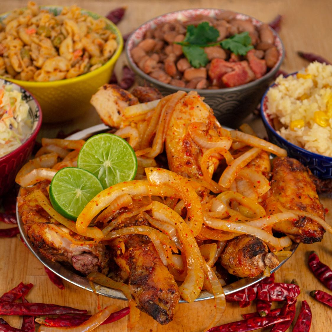 Bañado en BBQ combinado con nuestra salsa de chile de árbol y un toque de mantequilla, acompañado de arroz, frijoles charros, ensalada de macarron, ensalada de repollo y tortillas..
