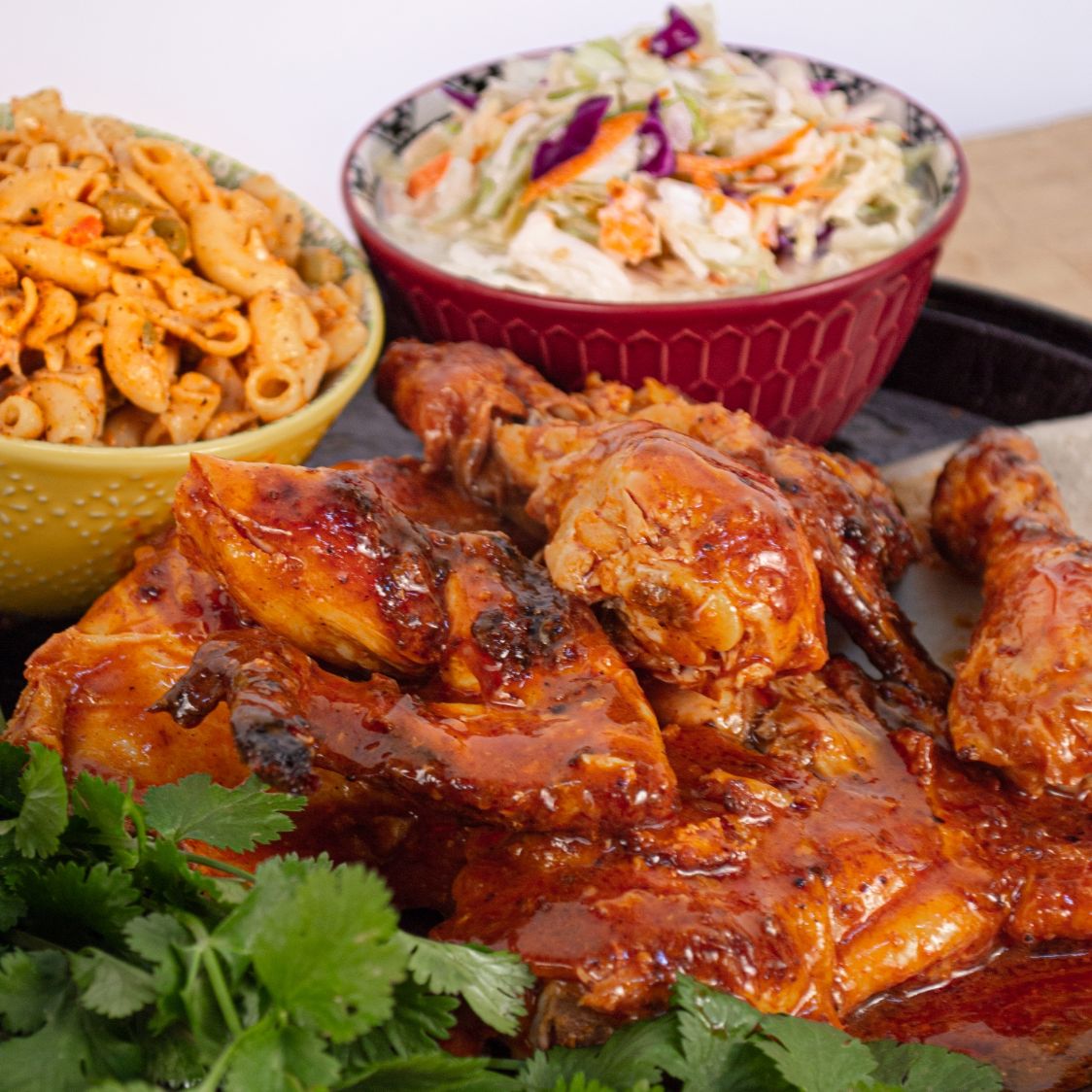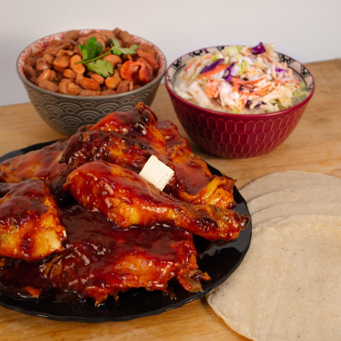 Bañado en salsa BBQ con un toque de mantequilla, acompañado de arroz, frijoles charros, ensalada de macarron, ensalada de repollo y tortillas..
