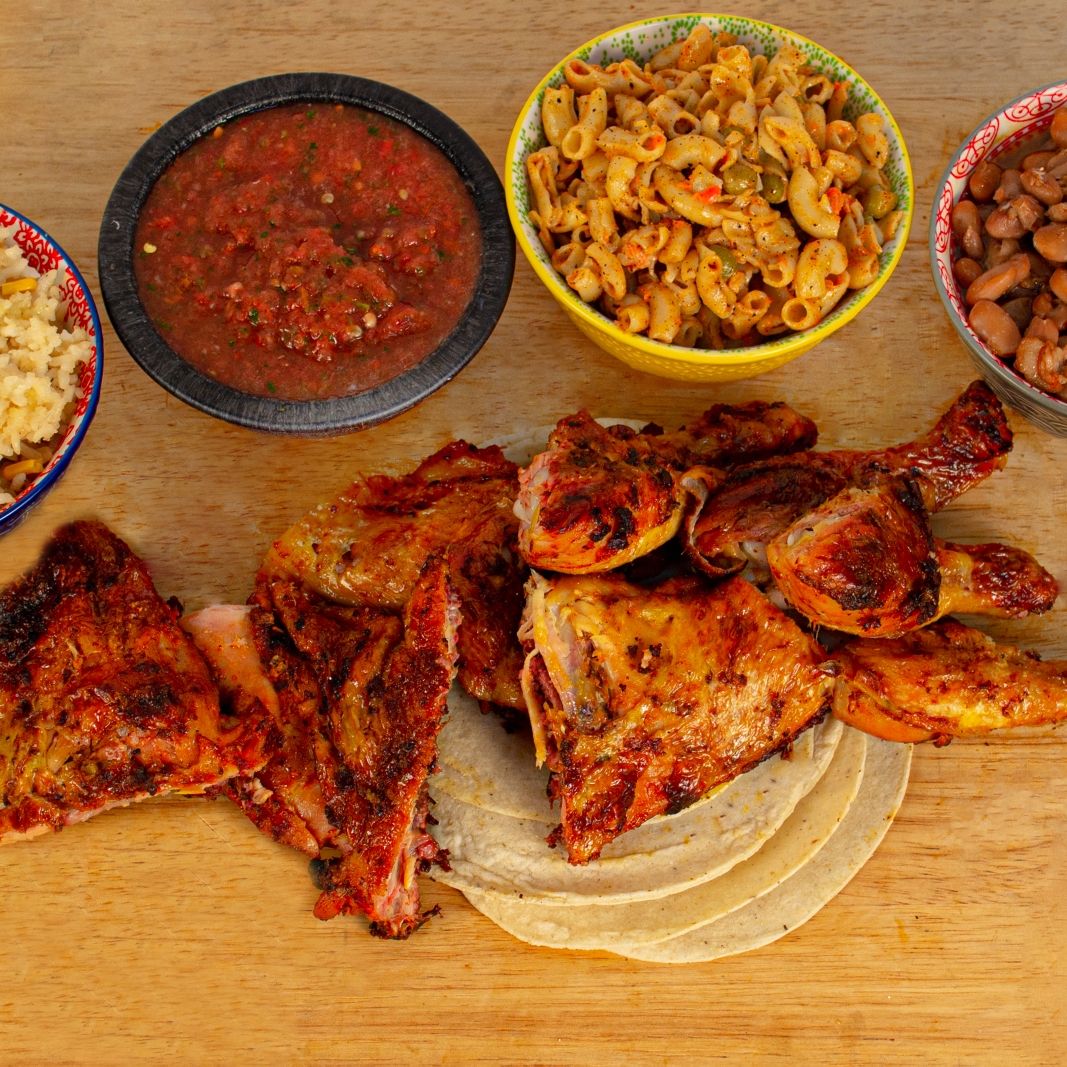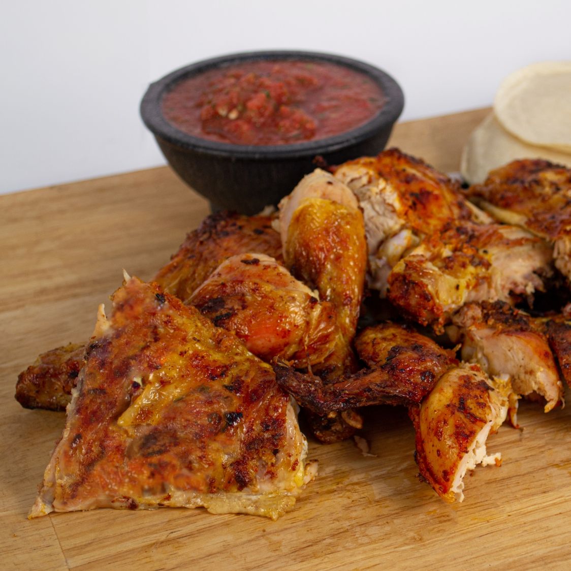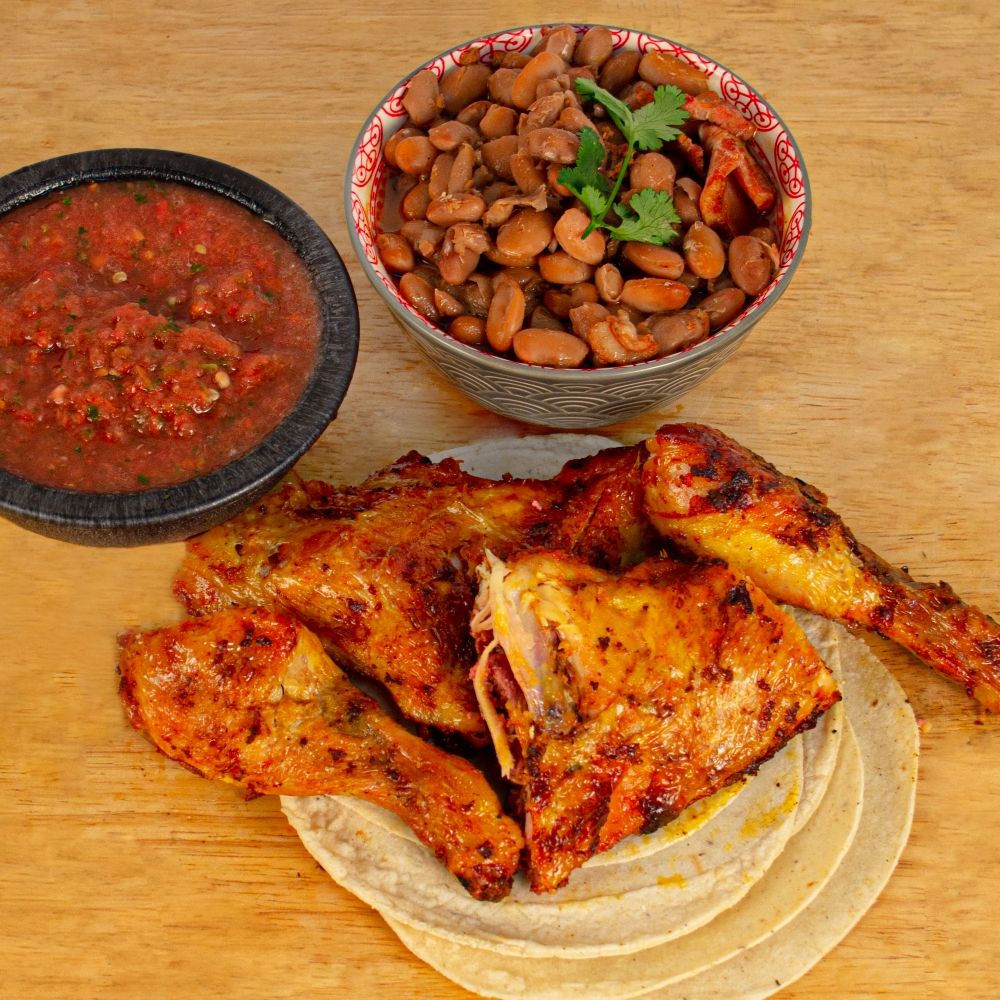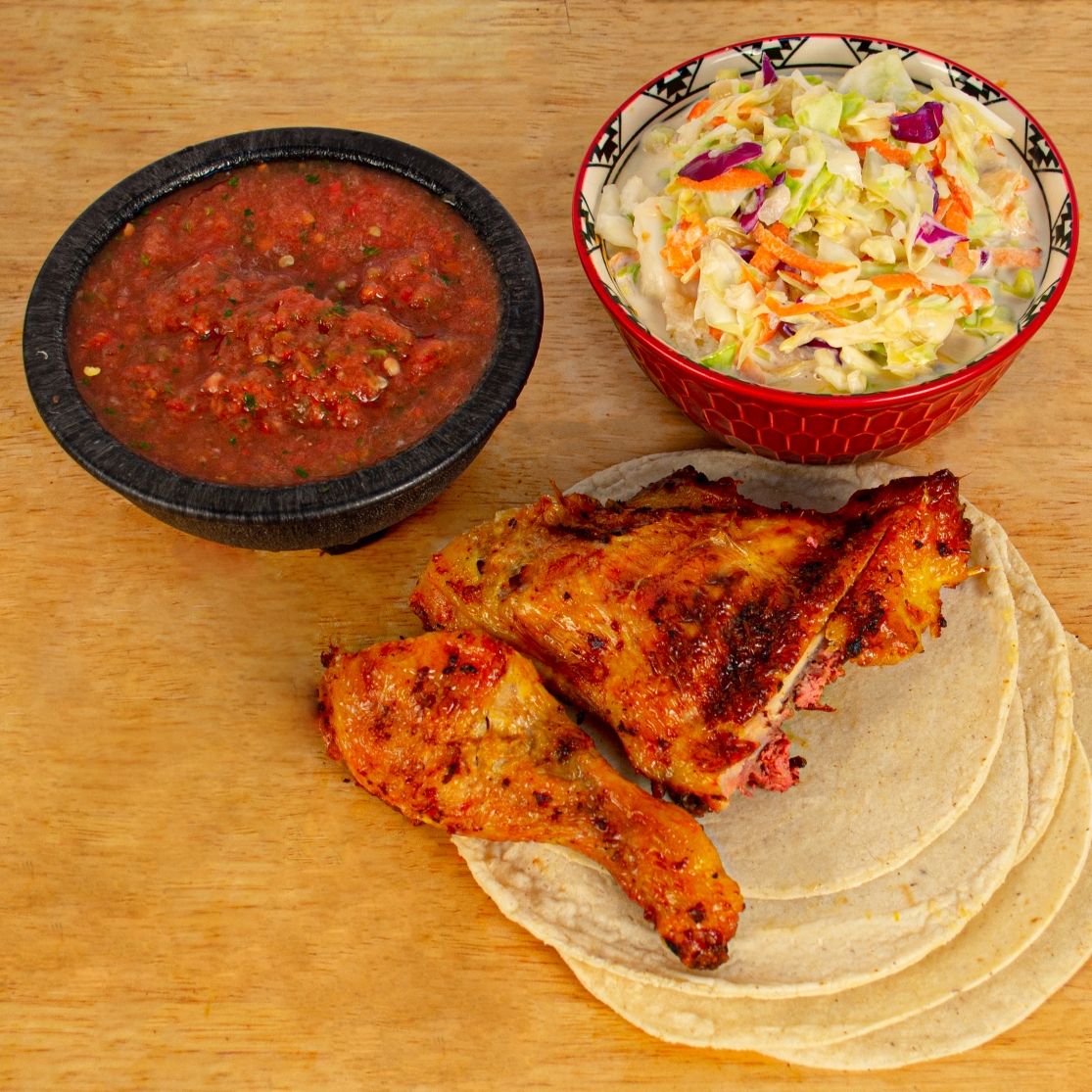 1 Pollo entero y 4 piezas de pierna y muslo, acompañado de salsa y tortillas.