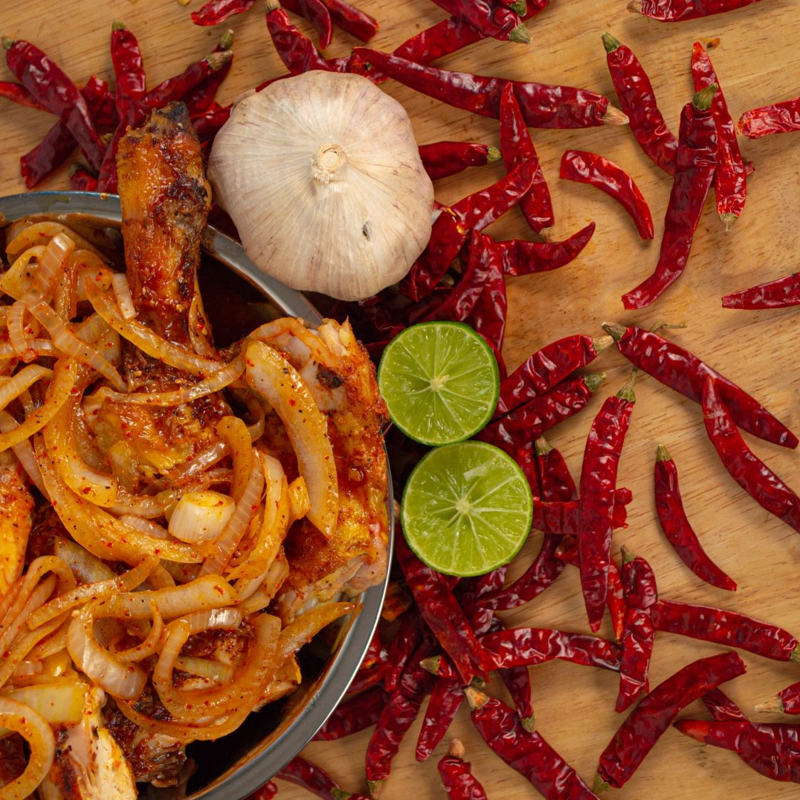 Medio Pollo bañado en nuestra salsa de chile de árbol con cebollita caramelizada y un toque de mantequilla. Acompañado de tortillas.