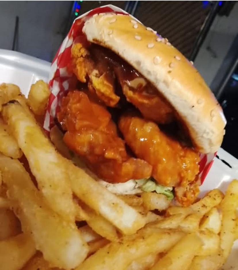 Hamburguesa de Pollo Empanizado, Lechuga, Tomate, Cebolla, y Aderezo Chipotle Bañada En Salsa de su Elección. Incluye Papas.