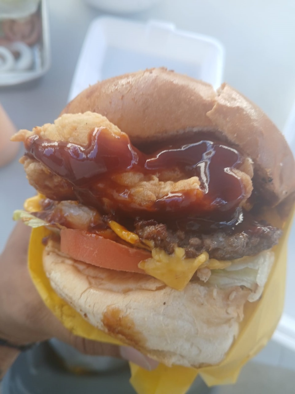 Hamburguesa con doble res, Aros de cebolla, queso, lechuga, tomate, cebolla y aderezo chipotle. Incluye papas.