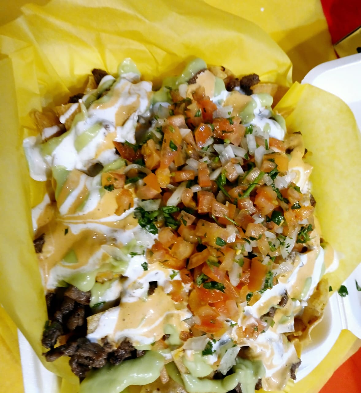 Carne asada, papas francesas, pico de gallo, queso monterey y cheddar, aderezo chipotle, guacamole y crema.