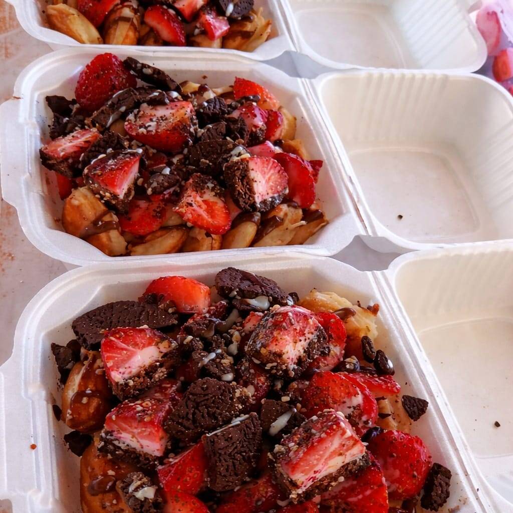 Deliciosa fresa fresca ,bañada en rica crema dulce,acompañado de tu topping favorito. Y rica base de galletas marias.