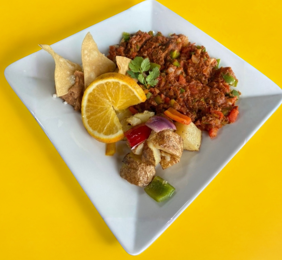 Machaca tradicional con chile, tomate y cebolla, frijol maneado y papa campesina.