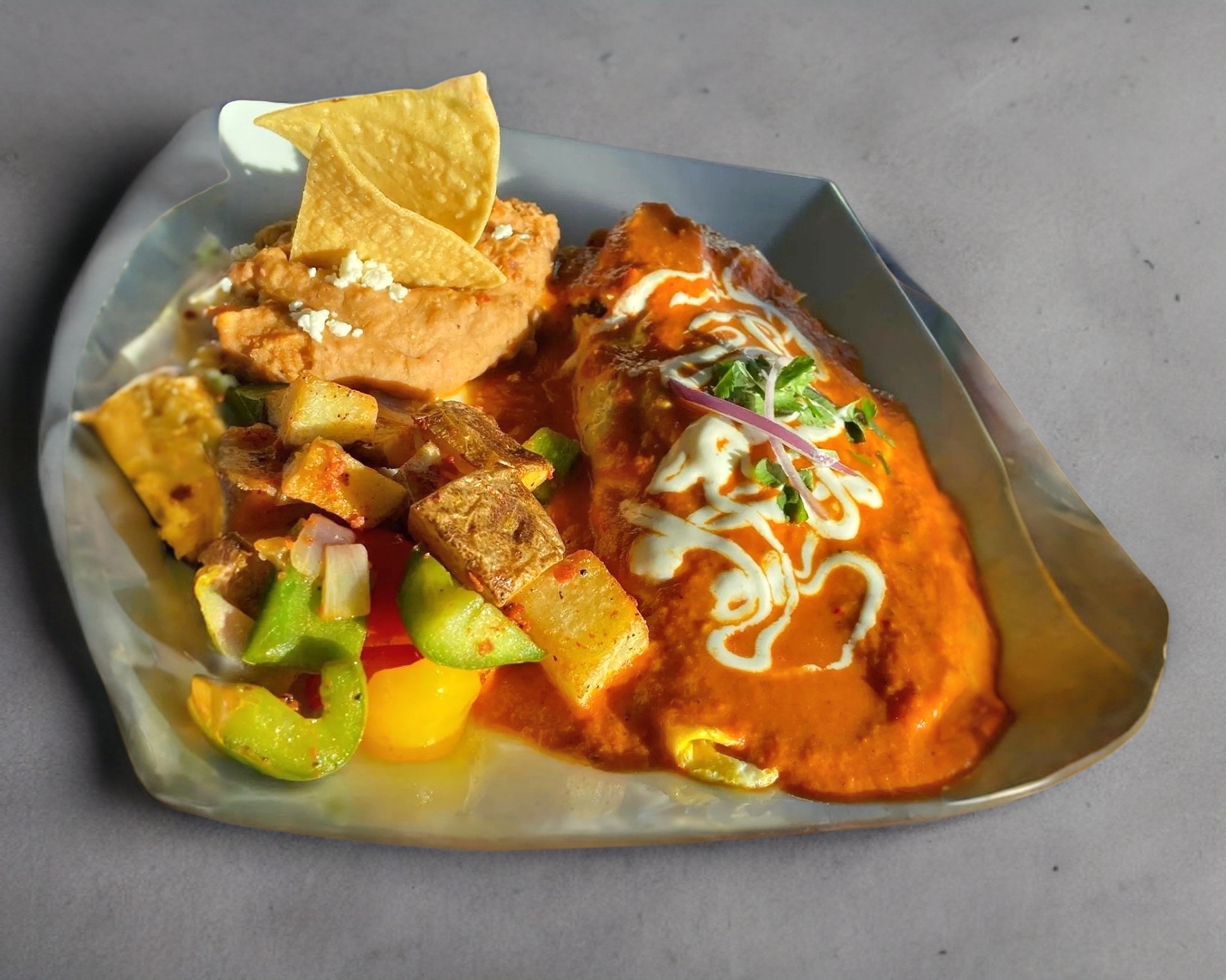 Chilaquiles rojos,1 huevo ,frijol maneado,papá campesina