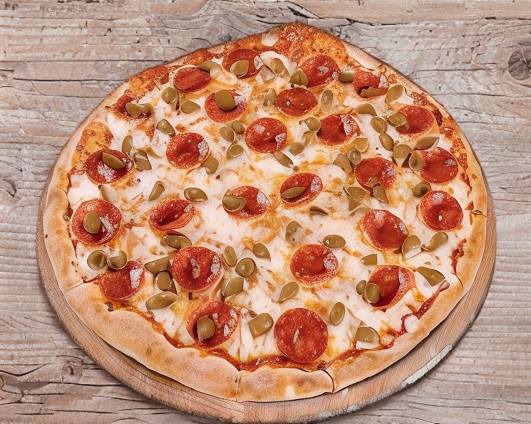 Pepperoni, salchicha italiana, aceituna negra, pimiento morrón, cebolla blanca y queso parmesano.