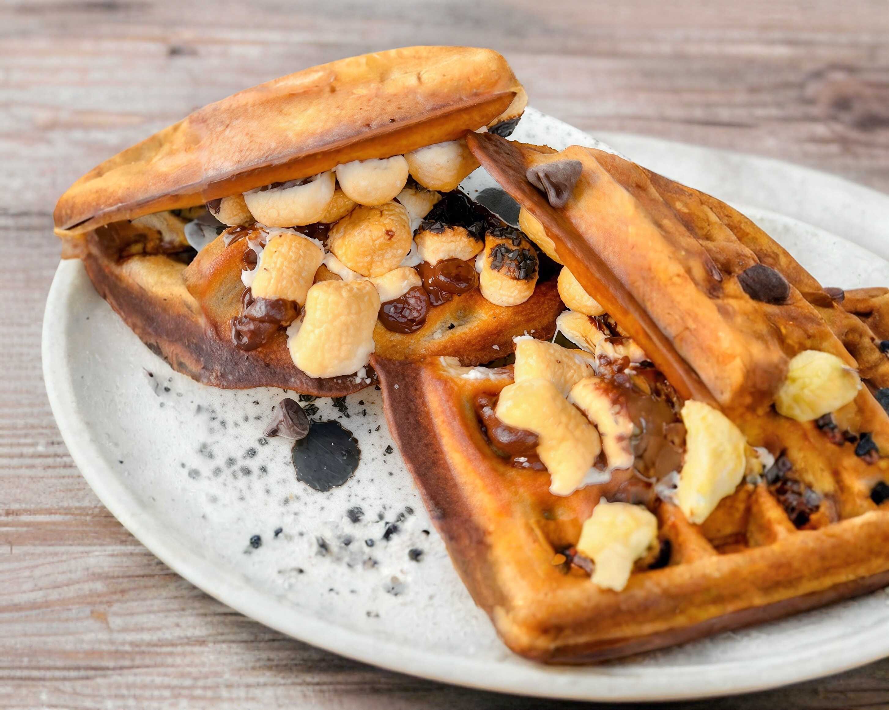Waffle con toque de jengibre, Chocolate y malvaviscos quemados.