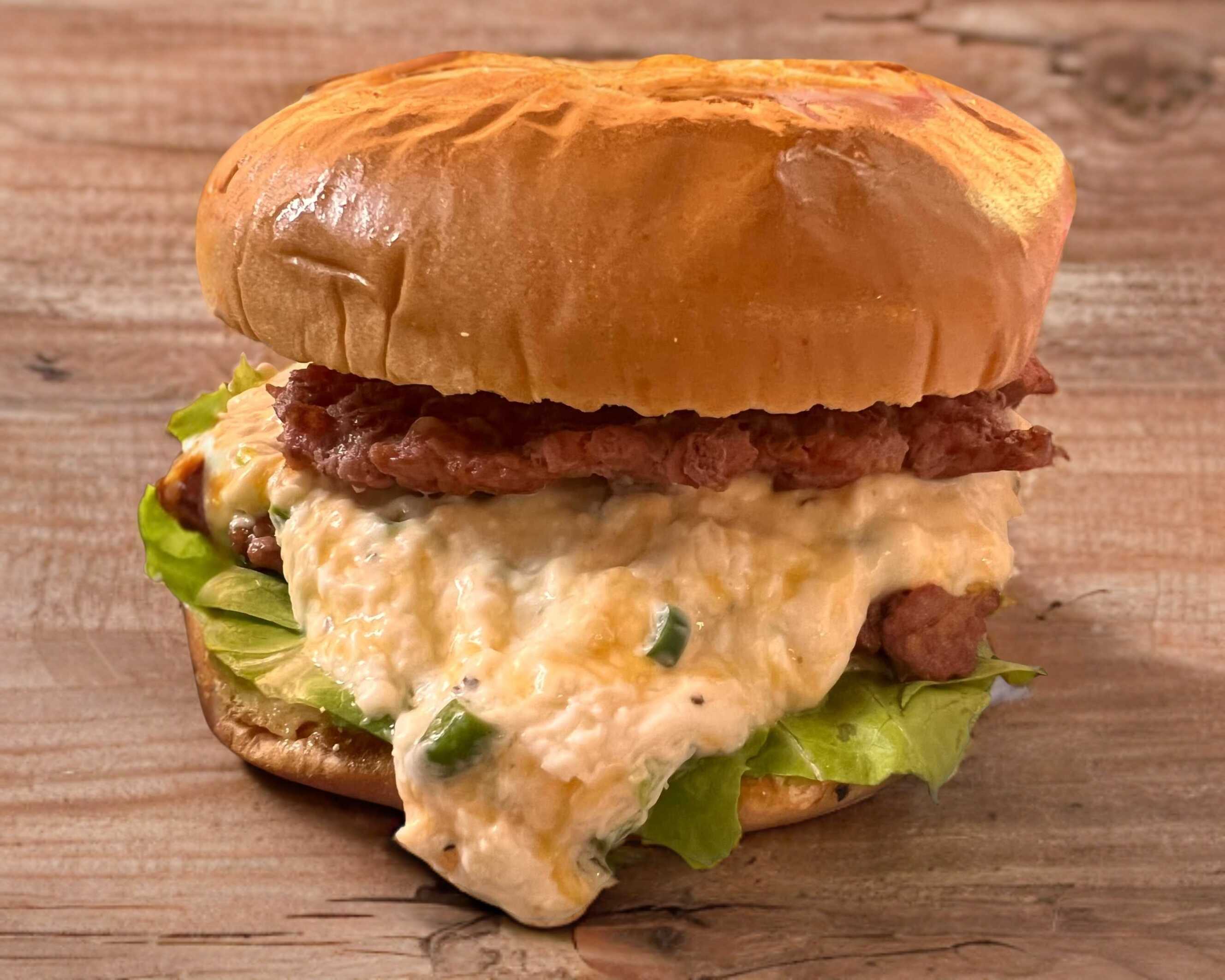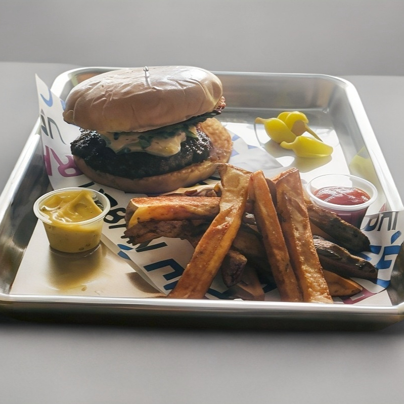 Doble carne de res con mezcla de quesos sazonado en medio y tocino. no incluye papas fritas.