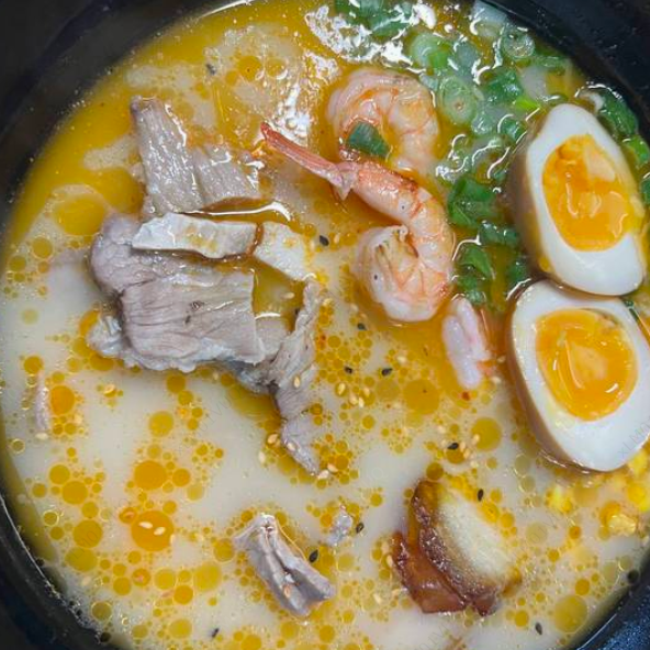 Rico fondo picante con fideo grueso de arroz top de rib y verduras.