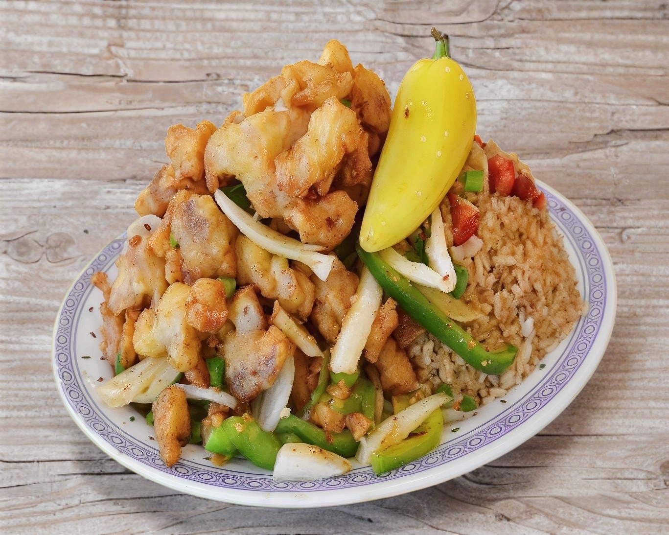 Pollo empanizado con cebolla y chile morrón en chile de árbol seco servido sobre una cama de chop suey. Incluye arroz blanco o frito, chiles asados, churritos, y limones. 🌶️