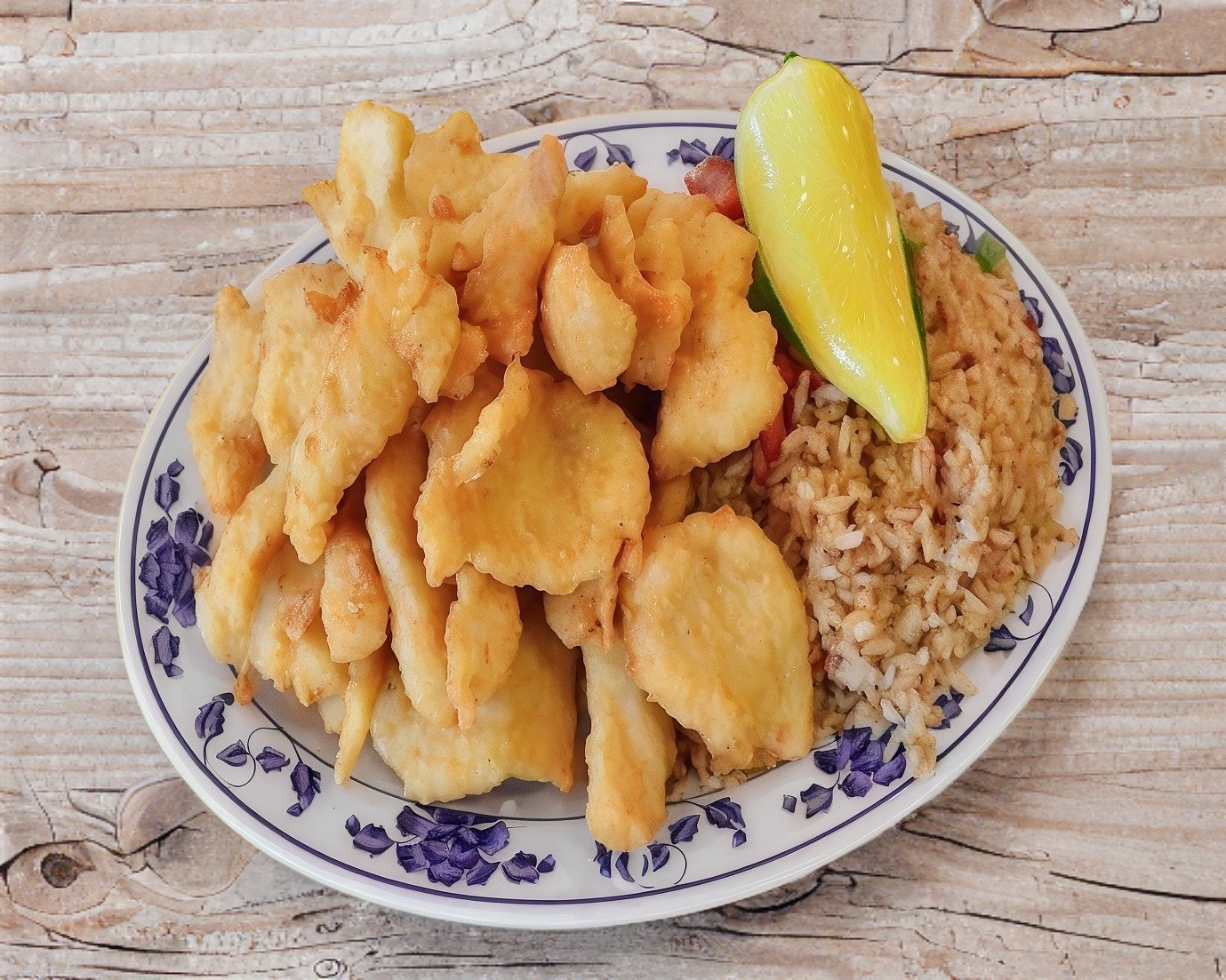 Pescado cantonés, arroz con camarón y chile asado. Incluye churritos, y limones.