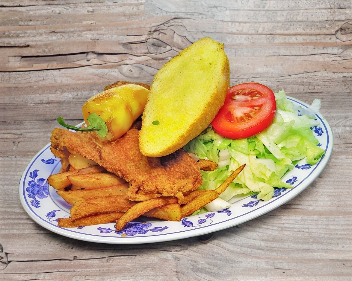 Pescado empanizado con cebolla y chile morrón cocinado con chile de árbol seco. Incluye arroz blanco o frito, chiles asados, churritos, y limones. 🌶️