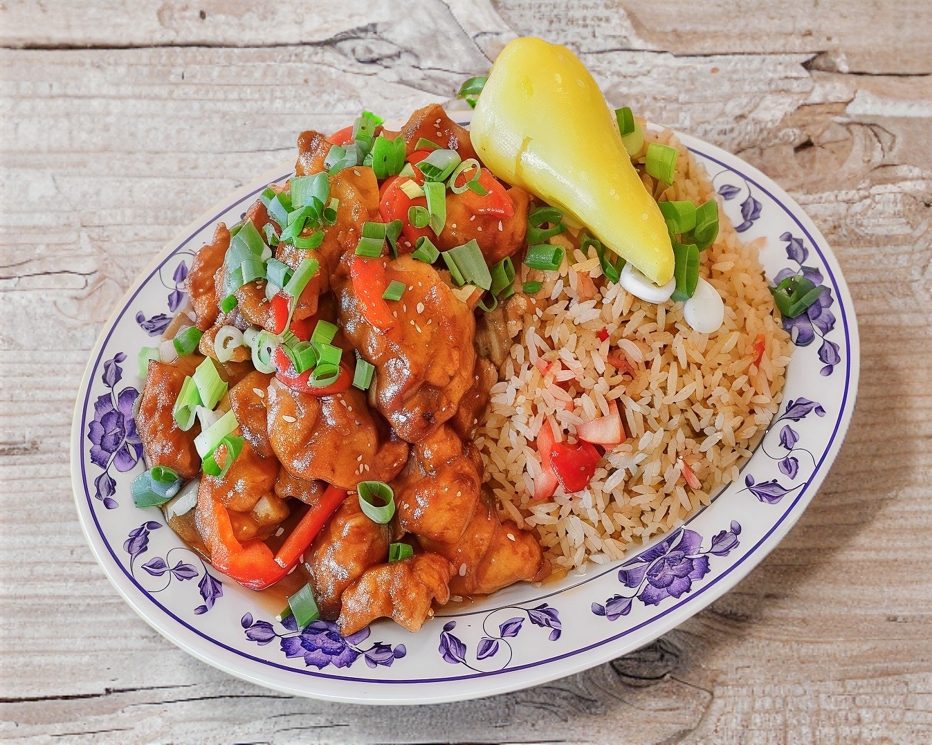 Pollo empanizado cocinado con chile morrón en salsa agridulce y picoso. Incluye arroz blanco o frito, chiles asados, churritos, y limones. 🌶️