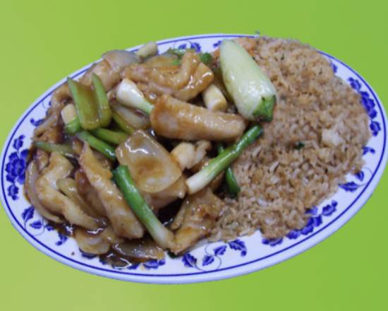 Pollo sin empanizar cocinado con apio, cebolla y jícama en salsa mongolia y chile de árbol seco. Incluye arroz blanco o frito, chiles asados, churritos, y limones. 🌶️