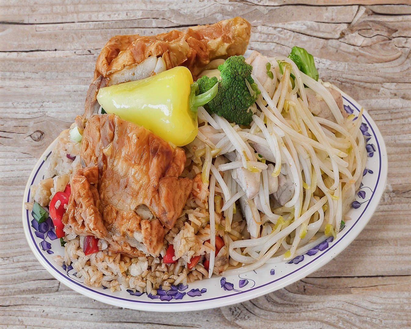 Brócoli, elotito, jícama, napa, zanahoria, pollo y fideo chino. Incluye arroz blanco o frito, chiles asados, churritos, y limones.