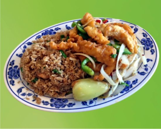 Calamar empanizado con cebolla y chile morrón cocinado con chile de árbol seco. Incluye arroz blanco o frito, chiles asados, churritos, y limones. 🌶️