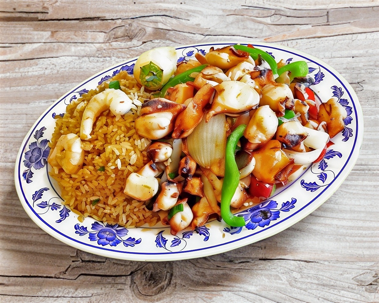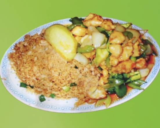 Mezcla de verduras con calamar, camarón, imitación de cangrejo, pescado y pulpo cocinado en salsa de soya. Incluye arroz blanco o frito, chiles asados, churritos, y limones.