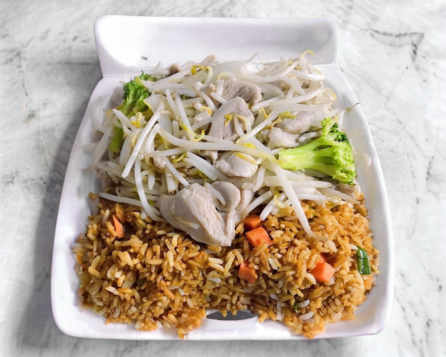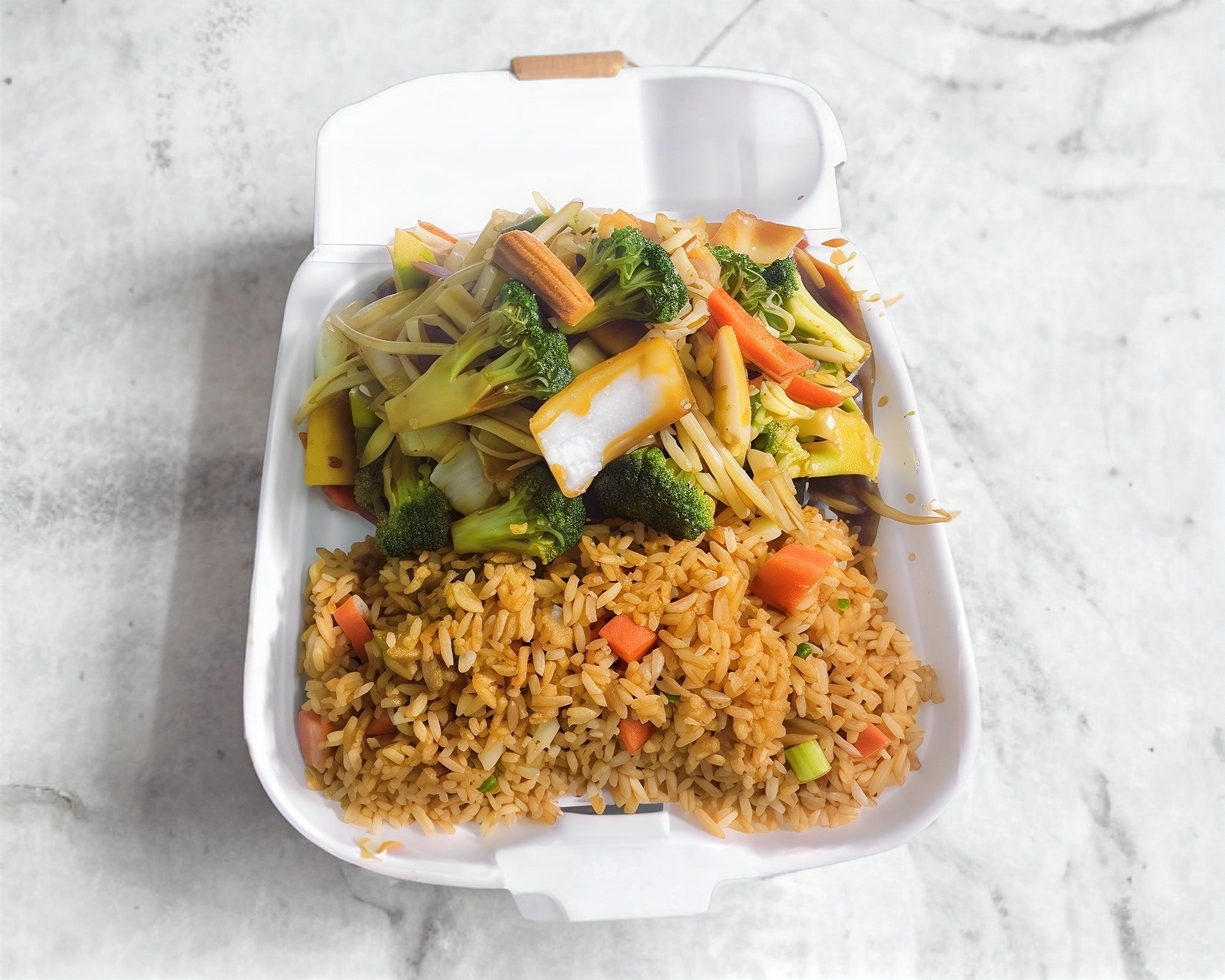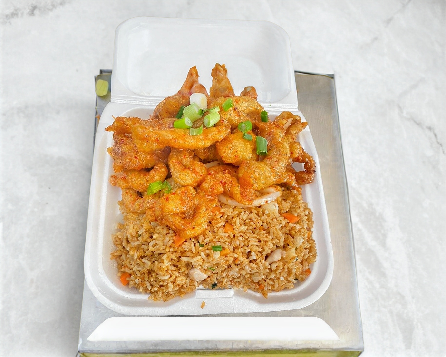 Chop suey de camarón y arroz con pollo.