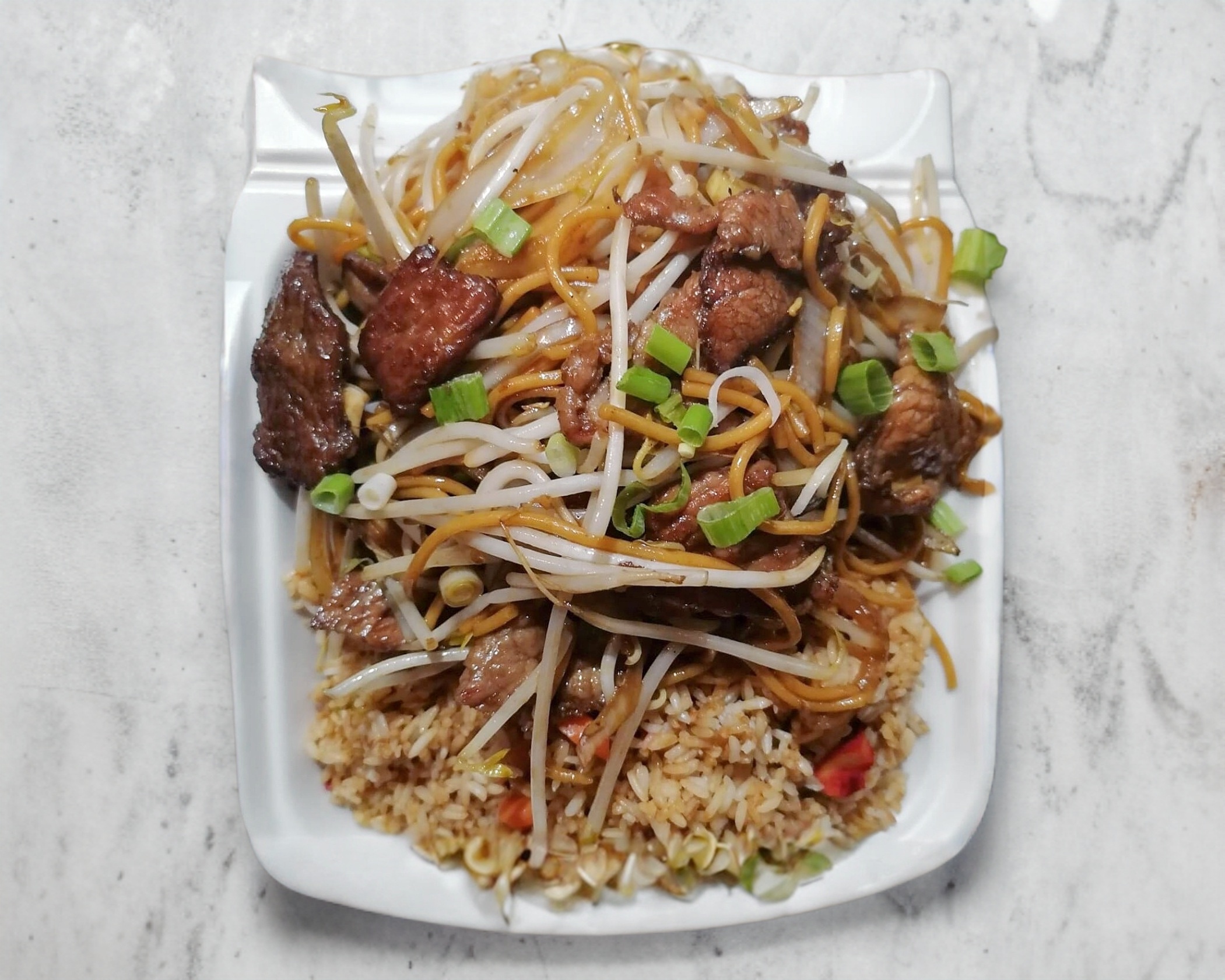 Low mein de res y arroz con pollo.