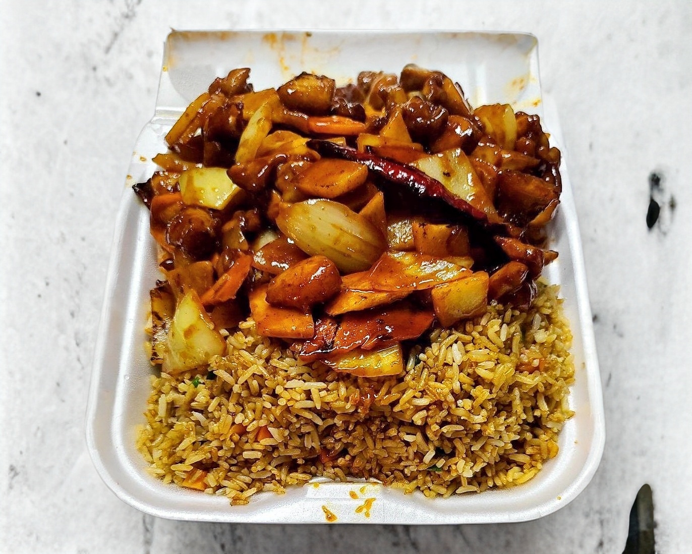 Pollo mongolia acompañado con arroz frito y un chunkun.