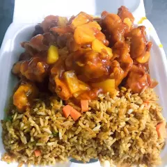 Pollo a la naranja acompañado con arroz frito y un chunkun.