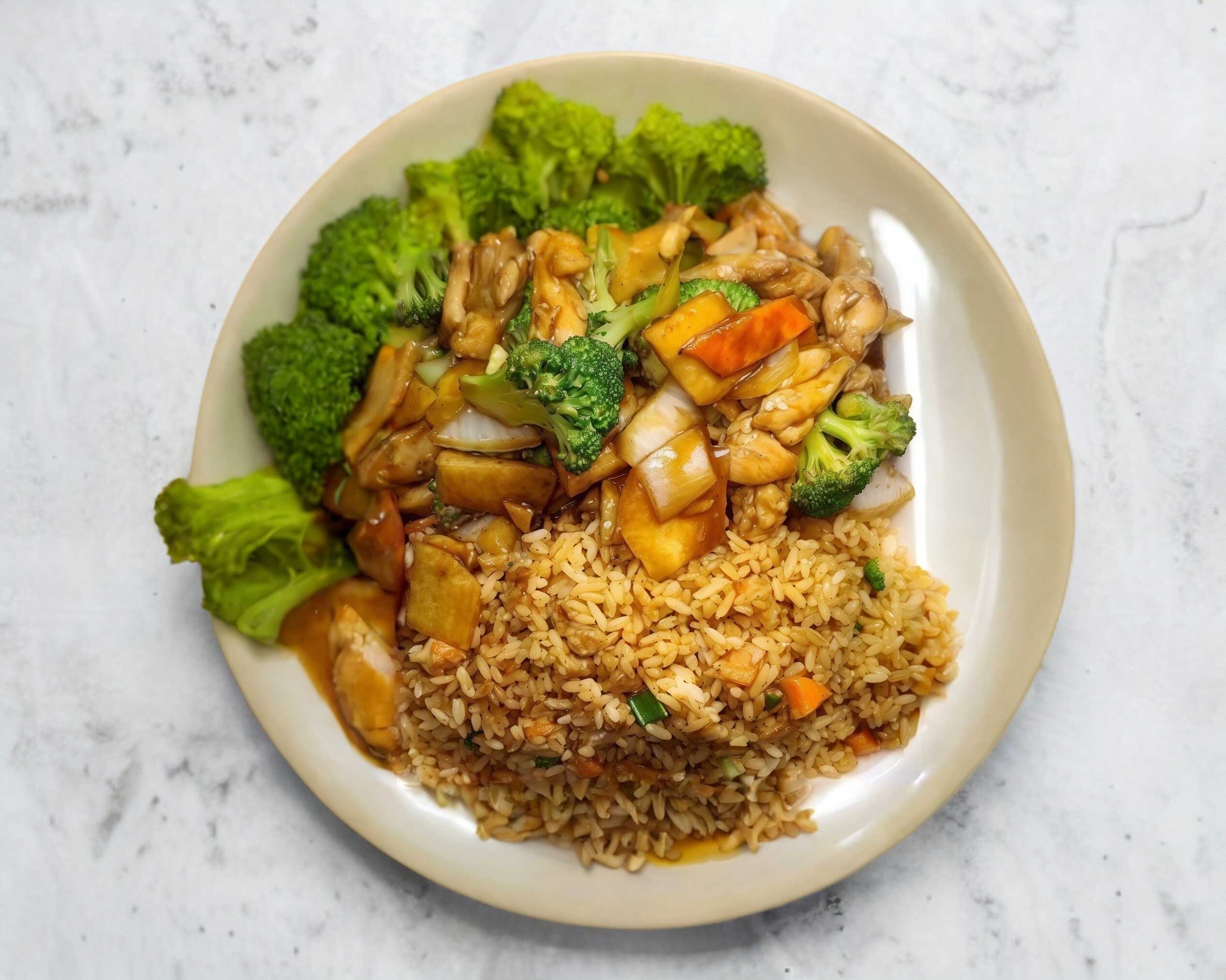 Pollo mongolia acompañado con arroz frito.