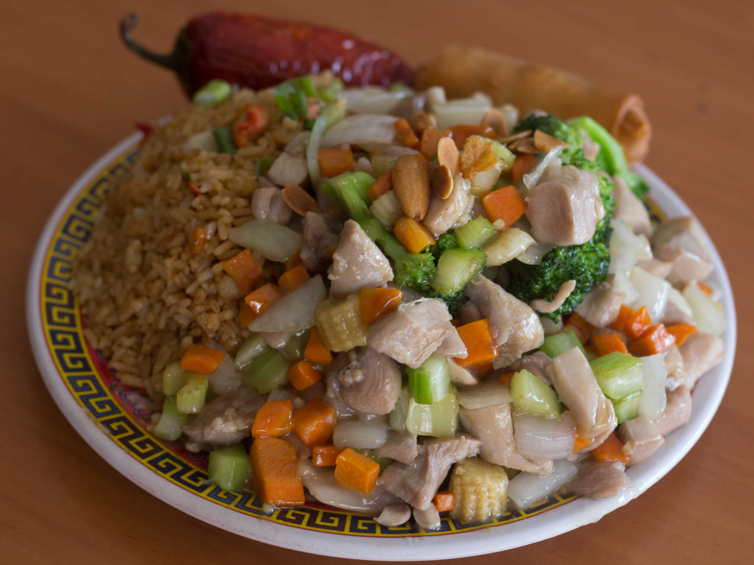 Arroz con puerco, pollo almendrado, chun kun y chile.
