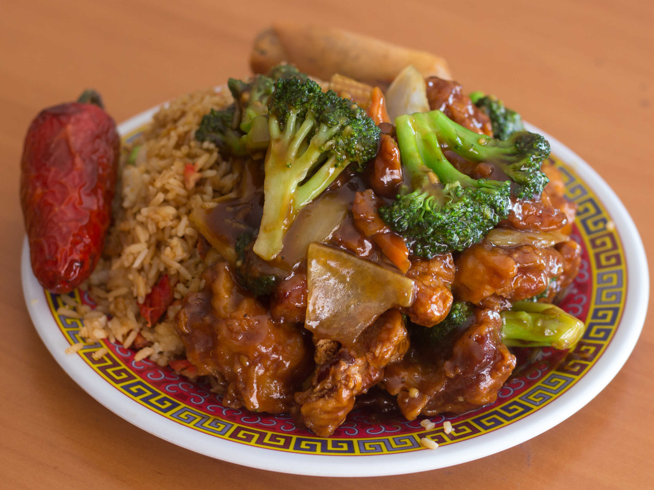 Arroz con puerco, pollo Kung pao, chun kun y chile.