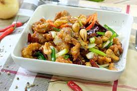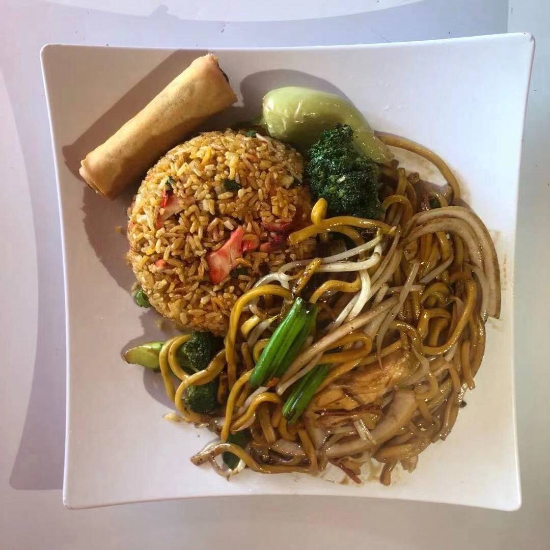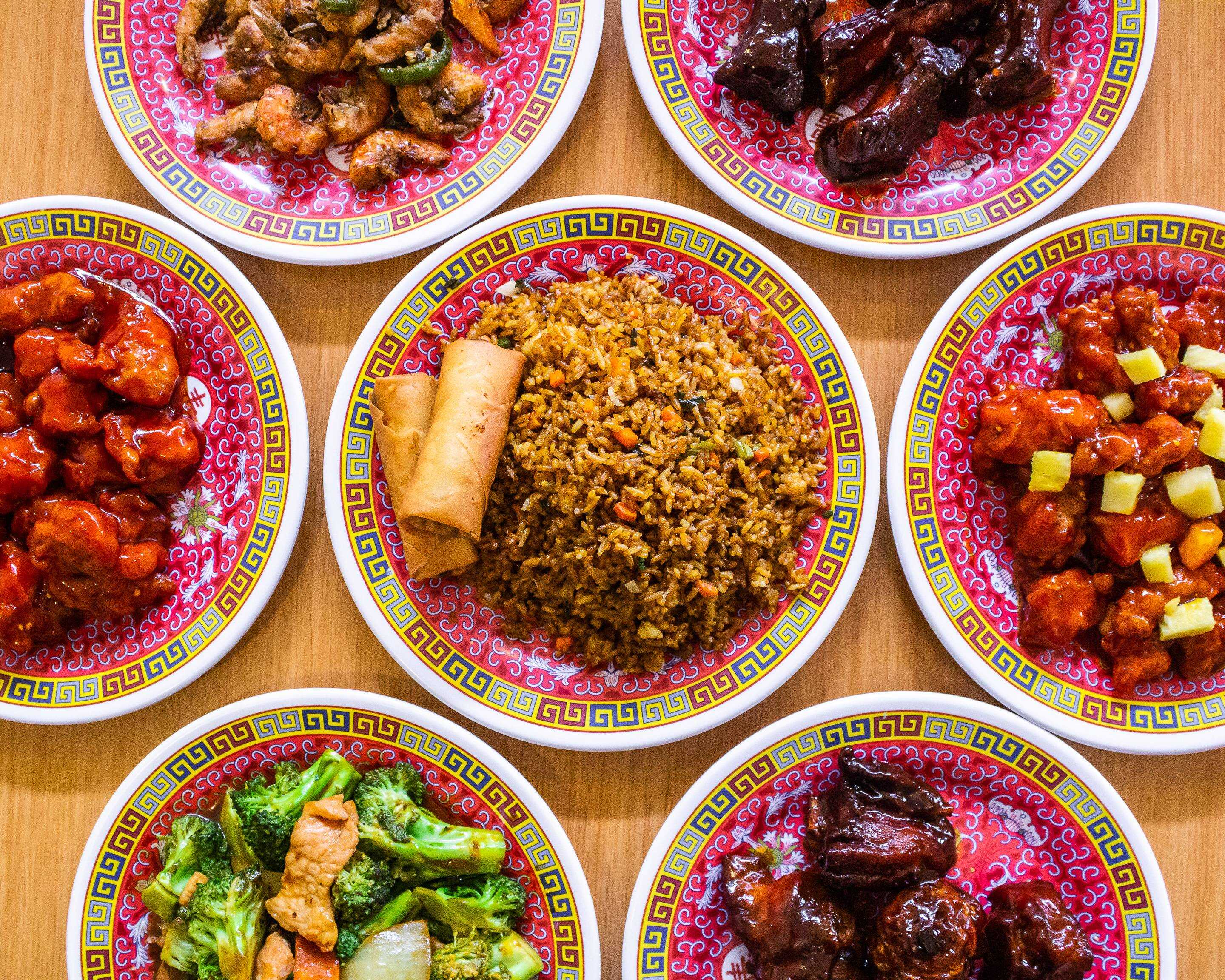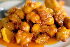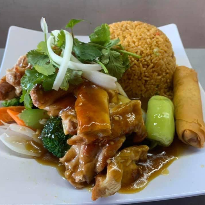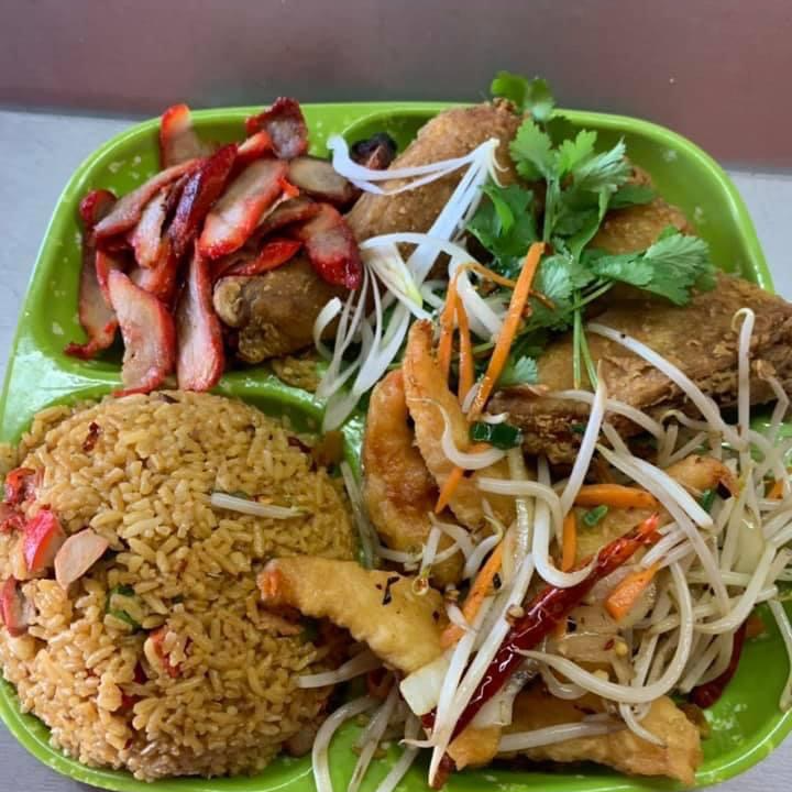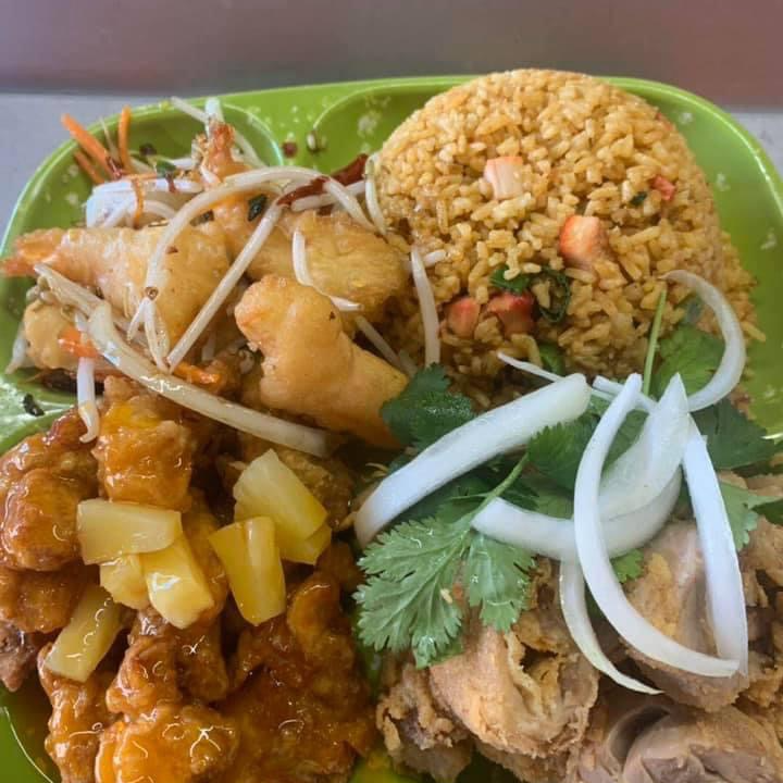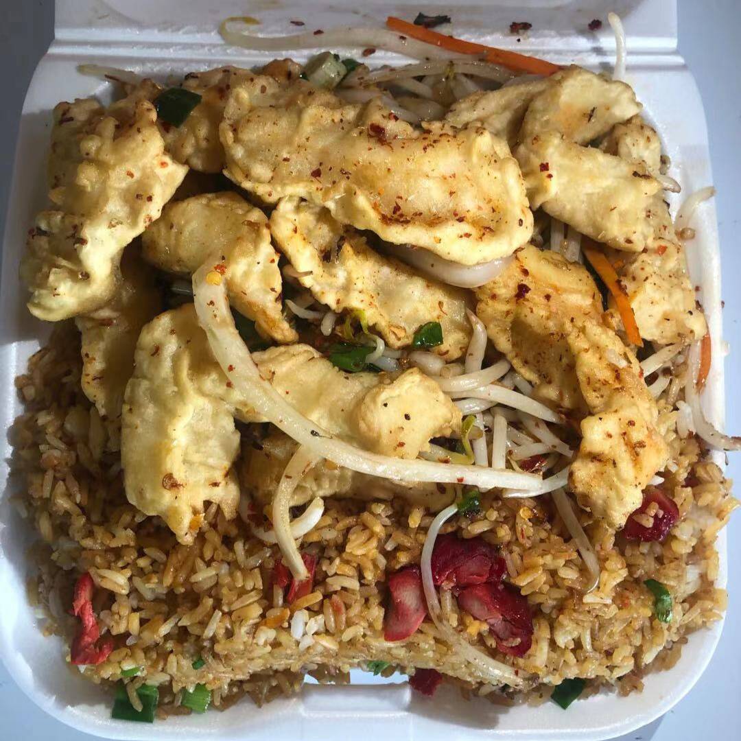 Pollo empanizado, camarón enchilado, pollo con piña, arroz frito.