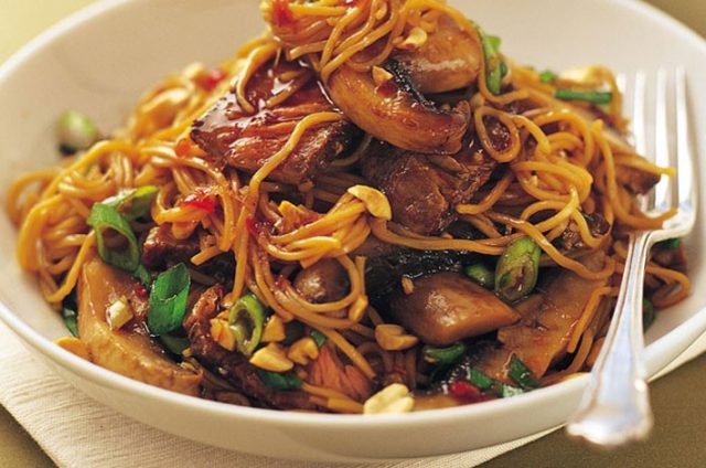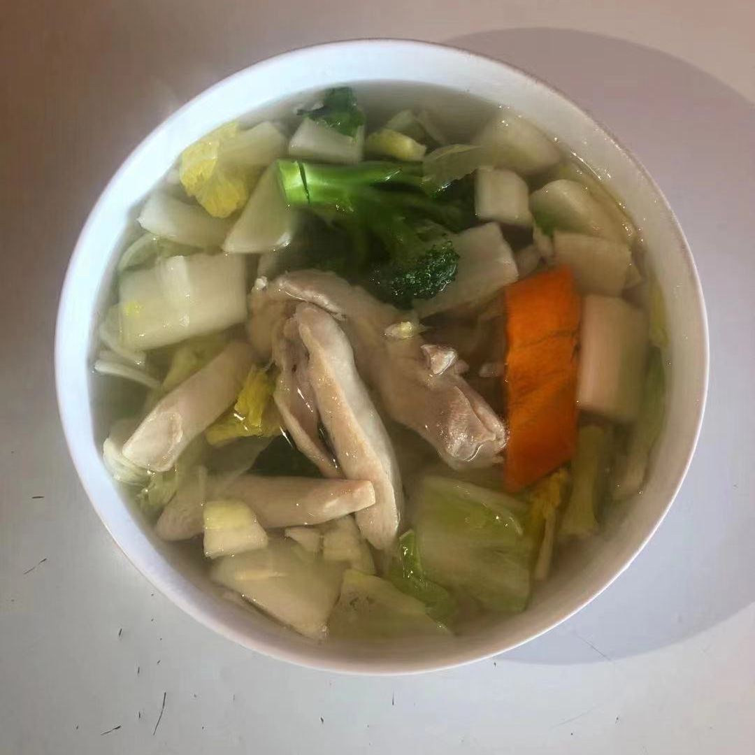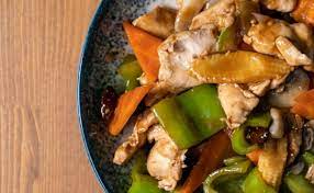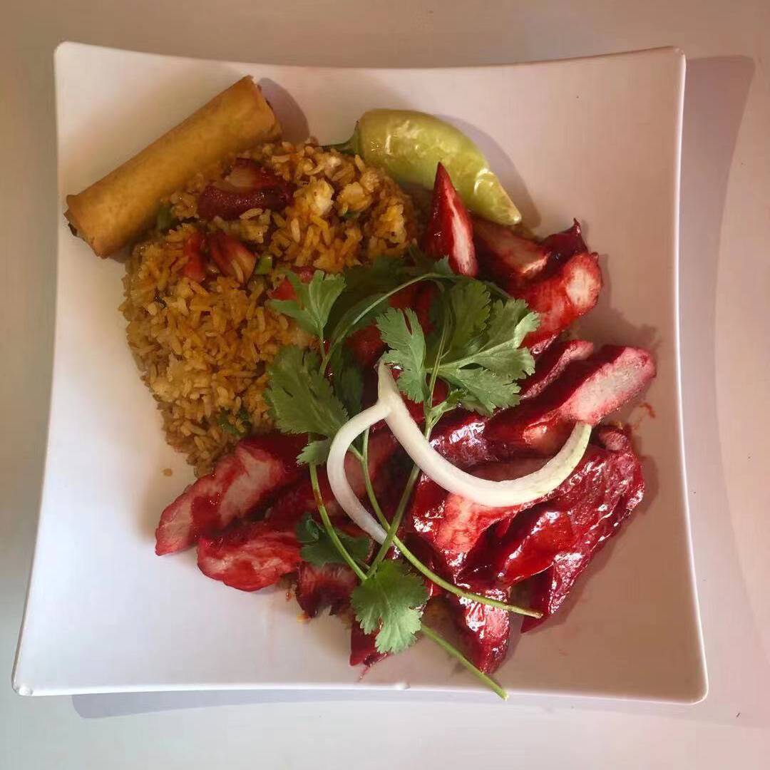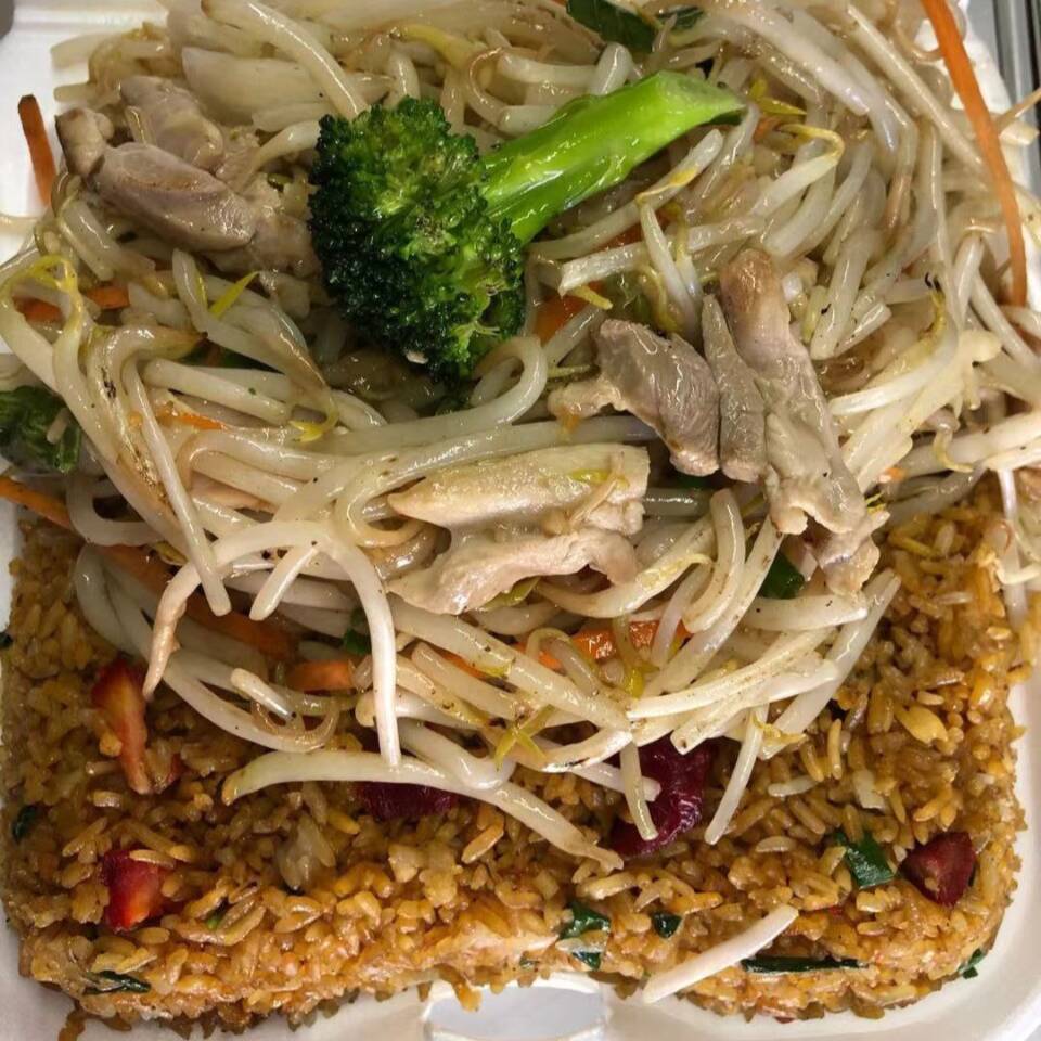 Caldo de pollo, arroz frito, pollo almendrado, chop suey con pollo, pollo con piña, carnitas de puerco, pollo asado.