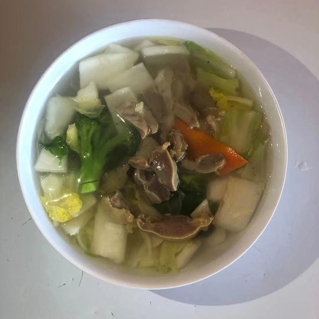 Caldo de mollejas, arroz frito, pollo cantonés, chop suey con pollo, pollo con piña, carnitas de puerco, chun kun.