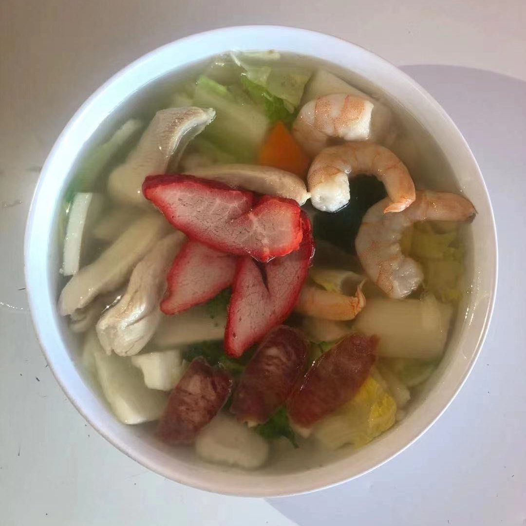 Caldo de aleta de tiburón, arroz con camarón, camarón enchilado, camarón salsa frijol, camarón almendrado, chun kun.