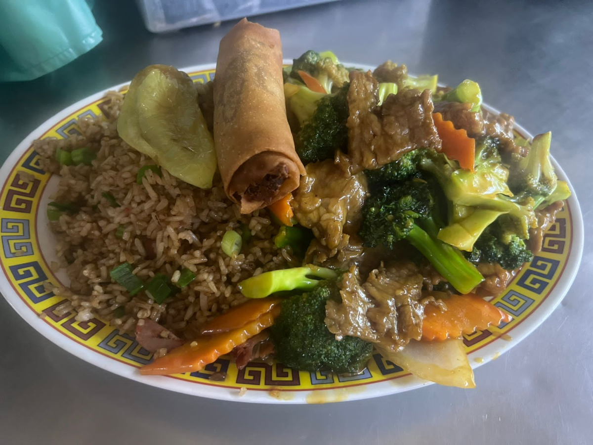 Caldo de mandarín, carnita asada, camarones almendrados, res con brócoli, pollo asado, arroz cantones, y pollo con piña