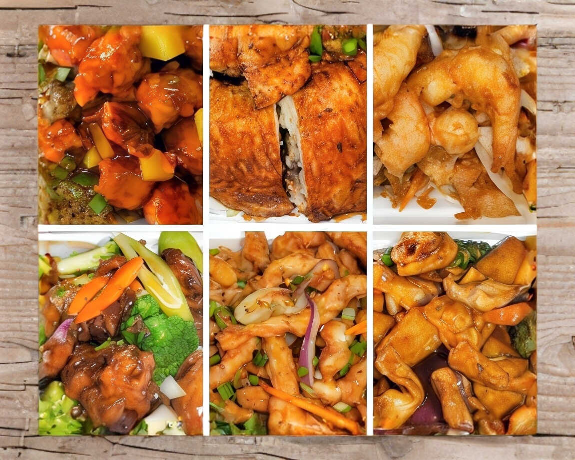 Pollo enchilado, pollo cantones, pollo frito, papás fritas, arroz frito con pollo.