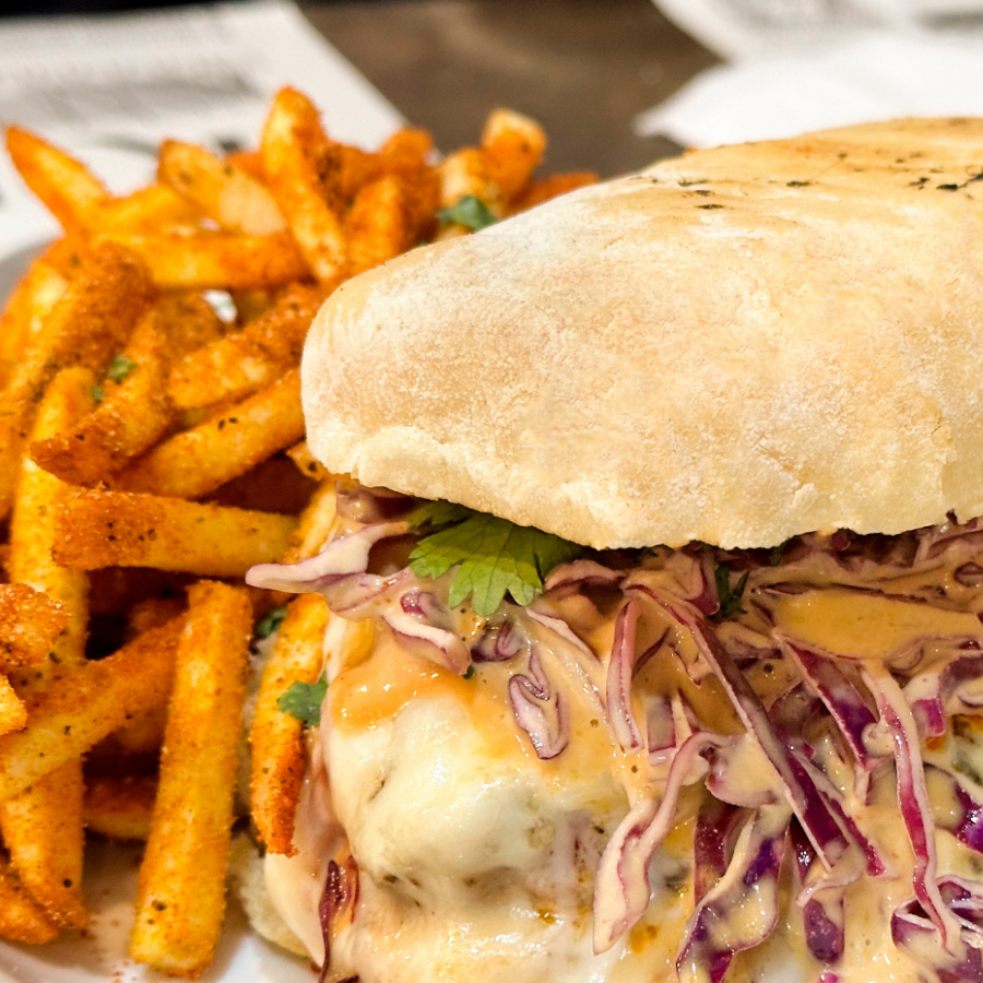 Torta en pan ciabatta con pechuga de pollo jugosa capeada crujiente, marinada en adobo tipo japones, con repollo morado, queso mozarella y aderezo de la casa, acompañada de papas fritas al parmesano y hierbas, exquisitamente deliciosa