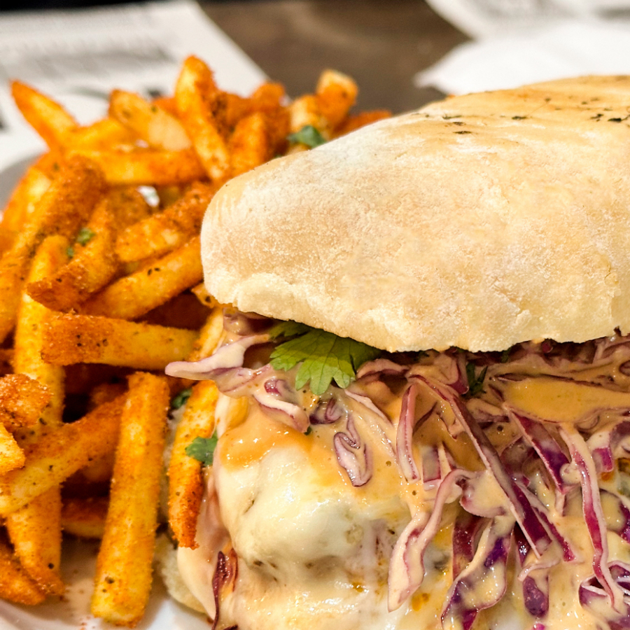 Torta en pan ciabatta con pechuga de pollo jugosa capeada crujiente, marinada en adobo tipo japones, con repollo morado, queso mozarella y aderezo de la casa, acompañadas de papas fritas al parmesano y hierbas, exquisitamente deliciosa.