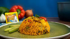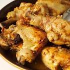 Pollo curry con papa, arroz con puerco, chile frito y chun kun.