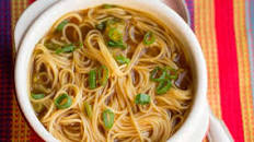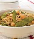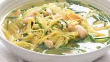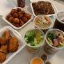 Caldo de noodle cantonés, res con brócoli, pollo cantonés, pollo relleno de jamón y pollo con piña. Servido para 4 personas.