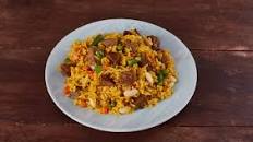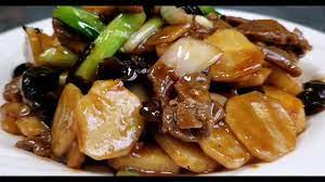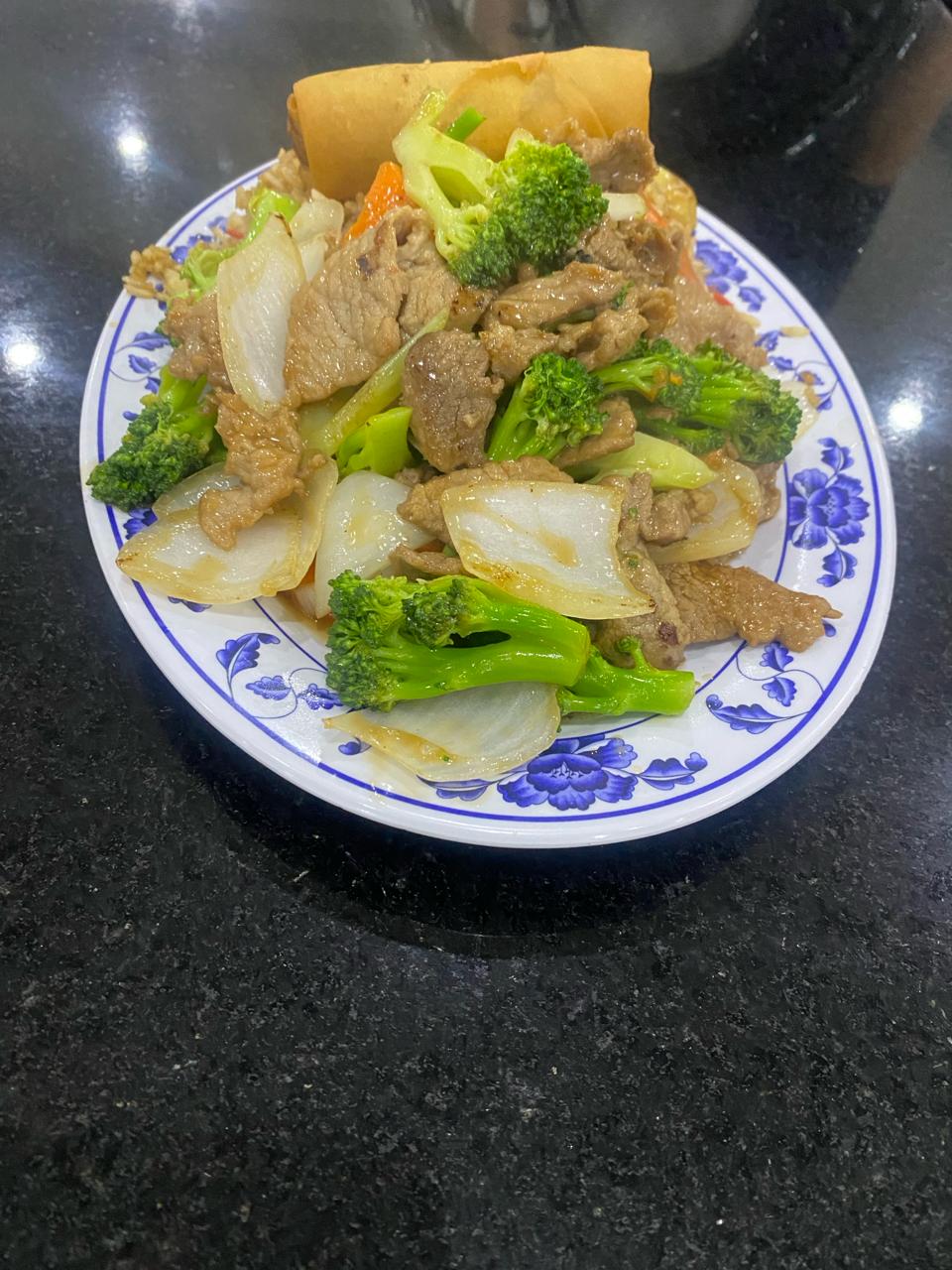 Res con brócoli, arroz con puerco, chile frito y chun kun.