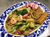 Aleta de tiburón, arroz con camarones, camarones, salsa de ostión, pescado empanizado, camarón almendrado, camarón con piña.