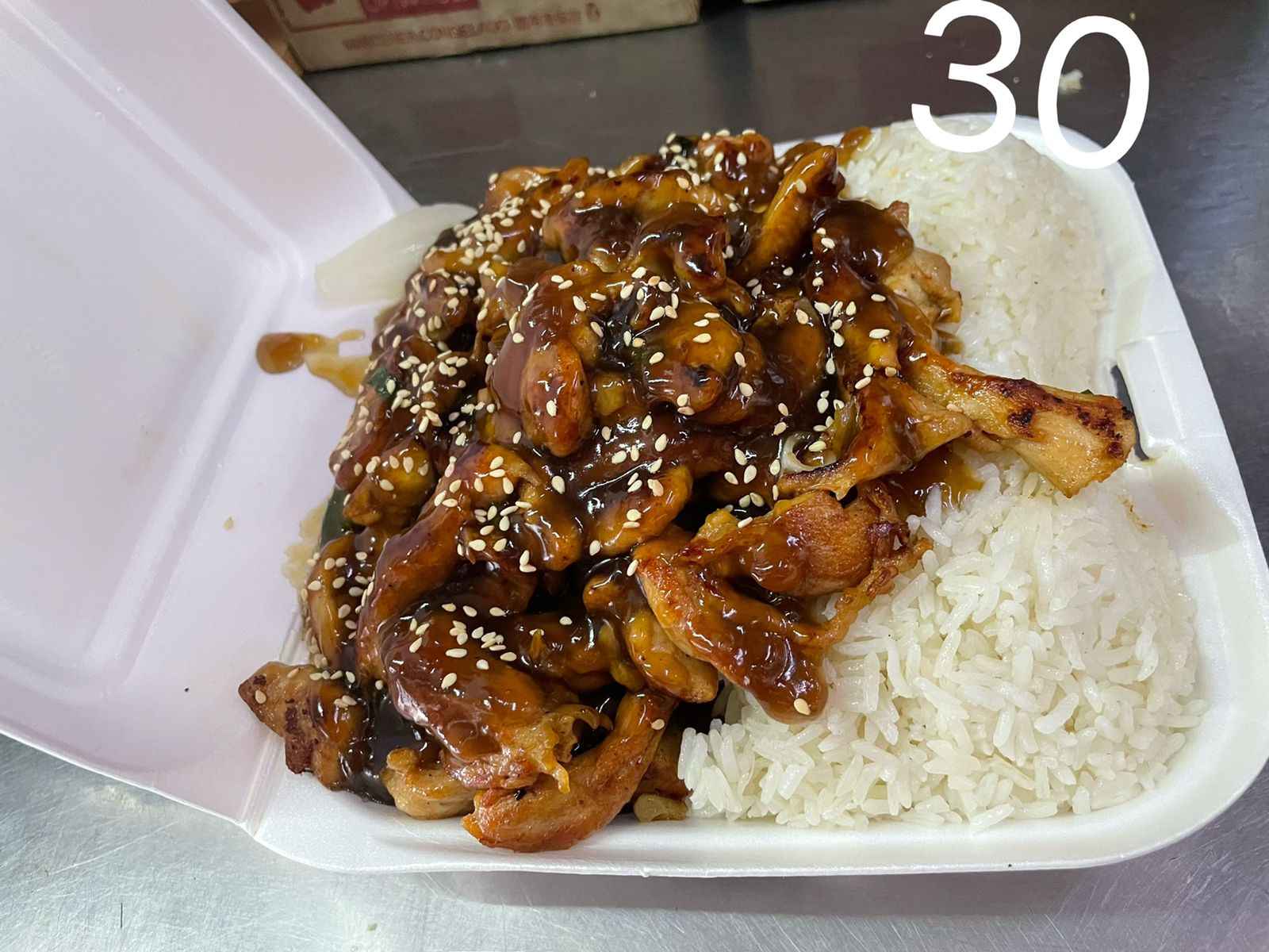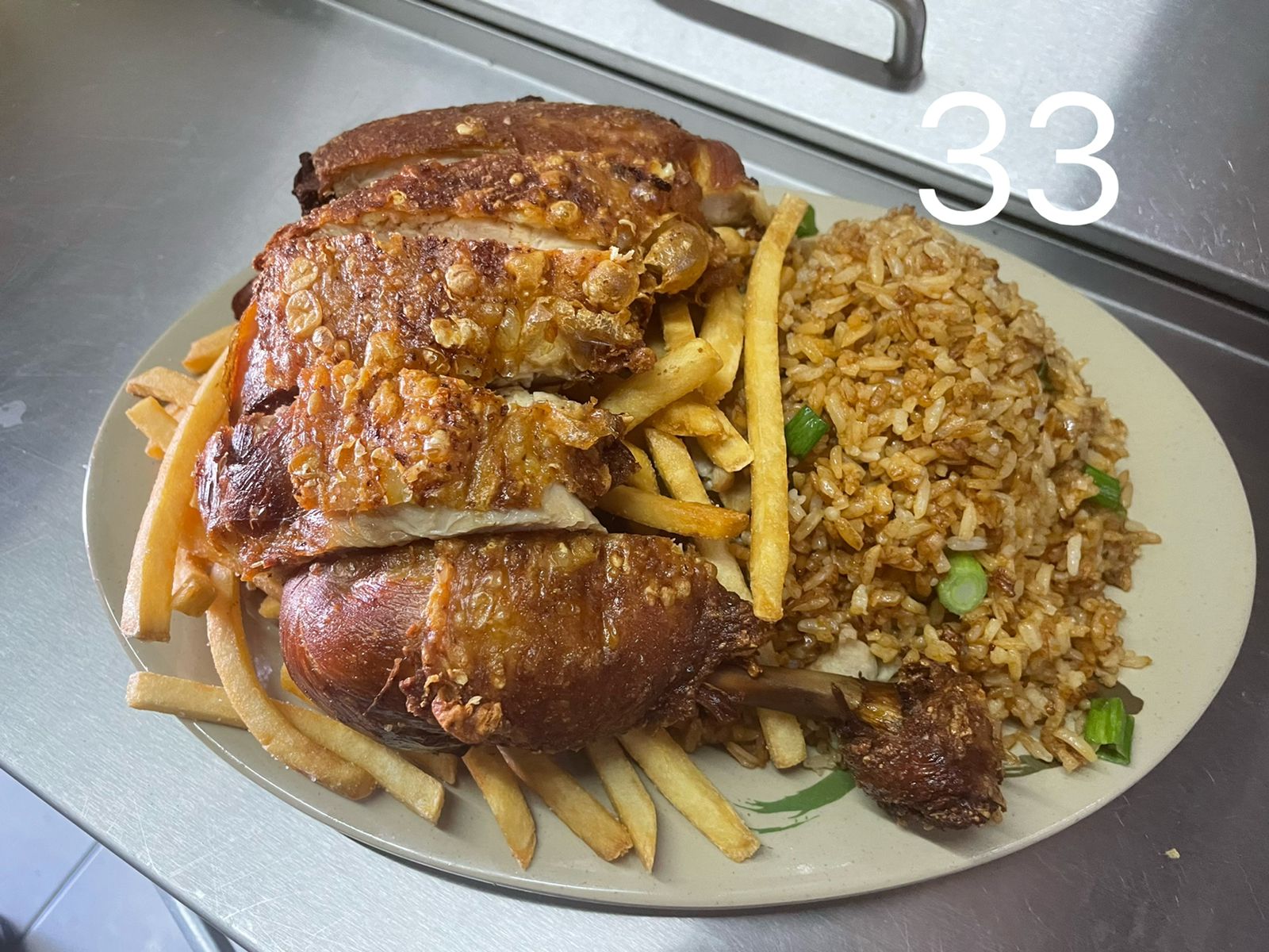 Cámaron cantonés (9 pzas) y arroz con pollo.